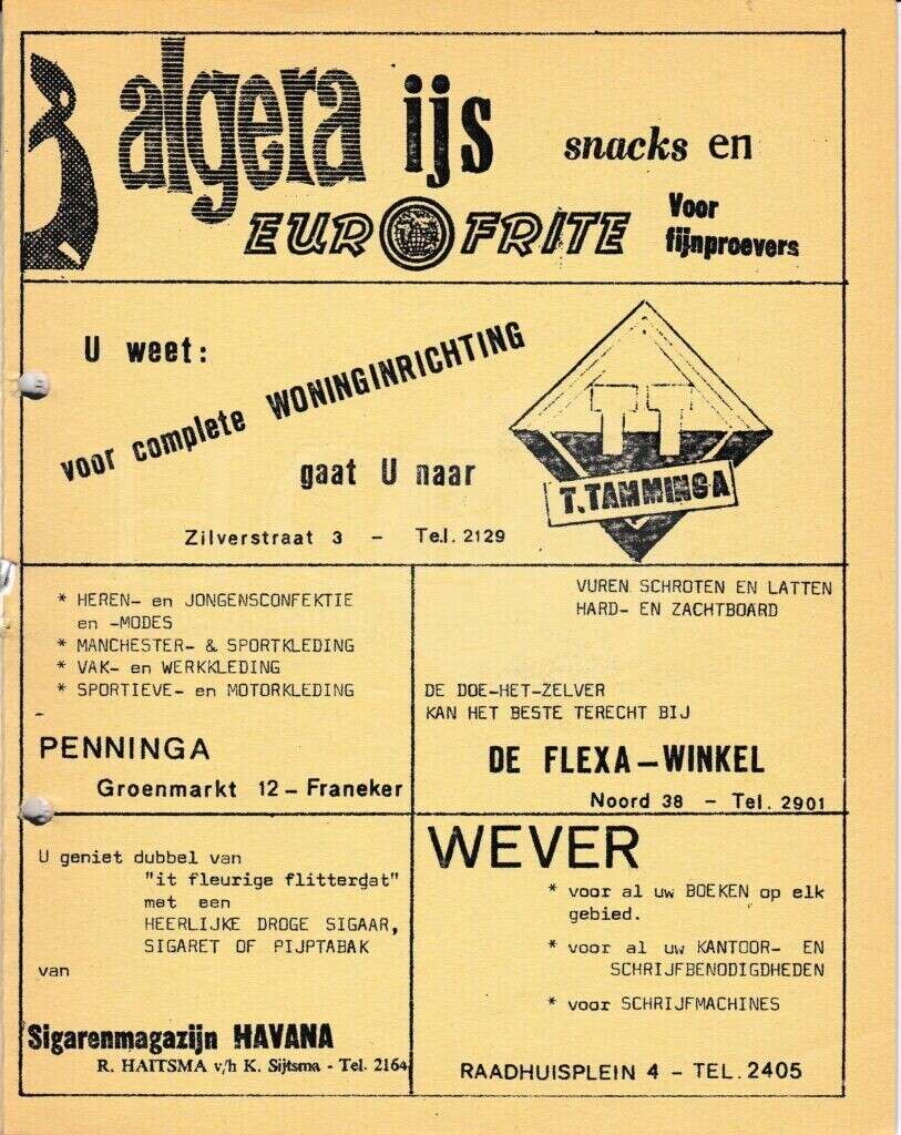 | Beschrijving: | It Fleurige Flittergat: 2de jaargang nr. 19: eklame; Cafetaria Algera Waagstraat 22, Woninginrichting T.Tamminga Zilverstraat 3, Herenmode Penninga Groenmarkt 12, De Flexa Noord 38, Sigarenmagazijn"Havana" K.Sijtsma Voorstraat 12, Boekhandel Wever Raadhuisplein 4 |