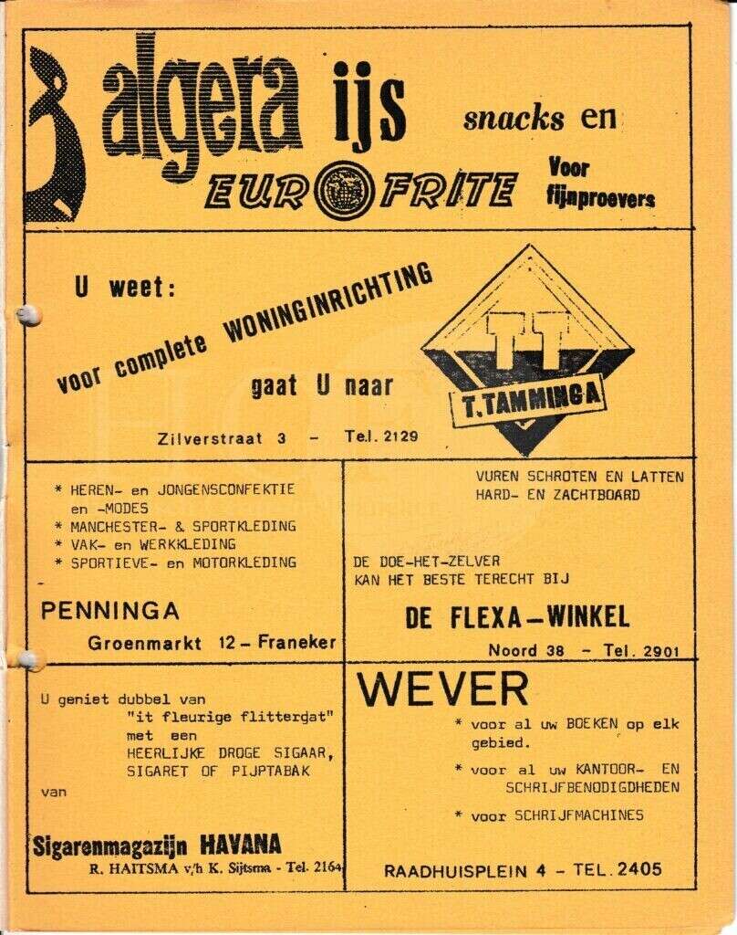 | Beschrijving: | It Fleurige Flittergat: 1966 2de jaargang nr. 20: Reklame; Cafetaria Algera Waagstraat 22, Woninginrichting T.Tamminga Zilverstraat 3, Herenmode Penninga Groenmarkt 12, De Flexa Noord 38, Sigarenmagazijn"Havana" K.Sijtsma Voorstraat 12, Boekhandel Wever Raadhuisplein 4 |