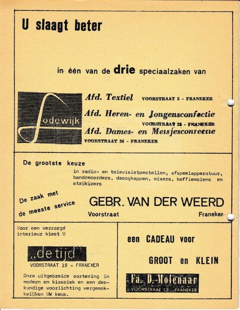 | Beschrijving: | It Fleurige Flittergat: 1966 2de jaargang nr. 21: Reklame; Lodewijk Textiel en kleding Voorstraat 5,23 en 34, Gebr. Van der Weert Voorstraat 25, Woning inrichting "De Tijd" Voorstraat 18, Fa.D.Molenaar Voorstaat 13 |