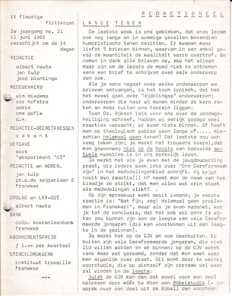 | Beschrijving: | It Fleurige Flittergat: 1966 2de jaargang nr. 21: Redactioneel; Lange tenen. |