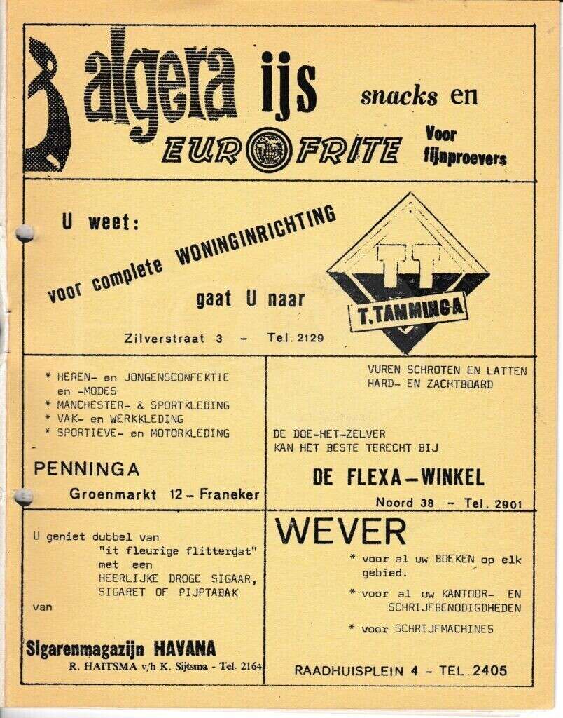 | Beschrijving: | It Fleurige Flittergat: 1966 2de jaargang nr. 21: Reklame; Cafetaria Algera Waagstraat 22, Woninginrichting T.Tamminga Zilverstraat 3, Herenmode Penninga Groenmarkt 12, De Flexa Noord 38, Sigarenmagazijn"Havana" K.Sijtsma Voorstraat 12, Boekhandel Wever Raadhuisplein 4 |