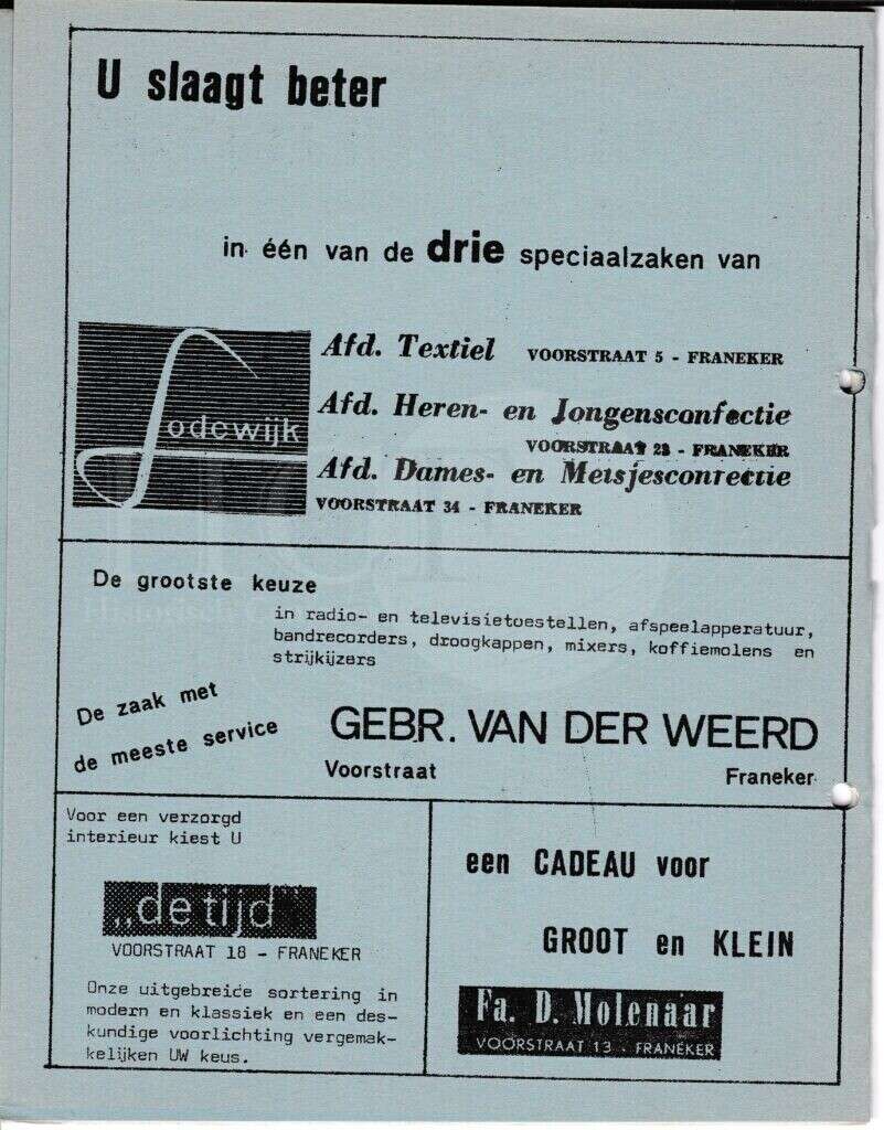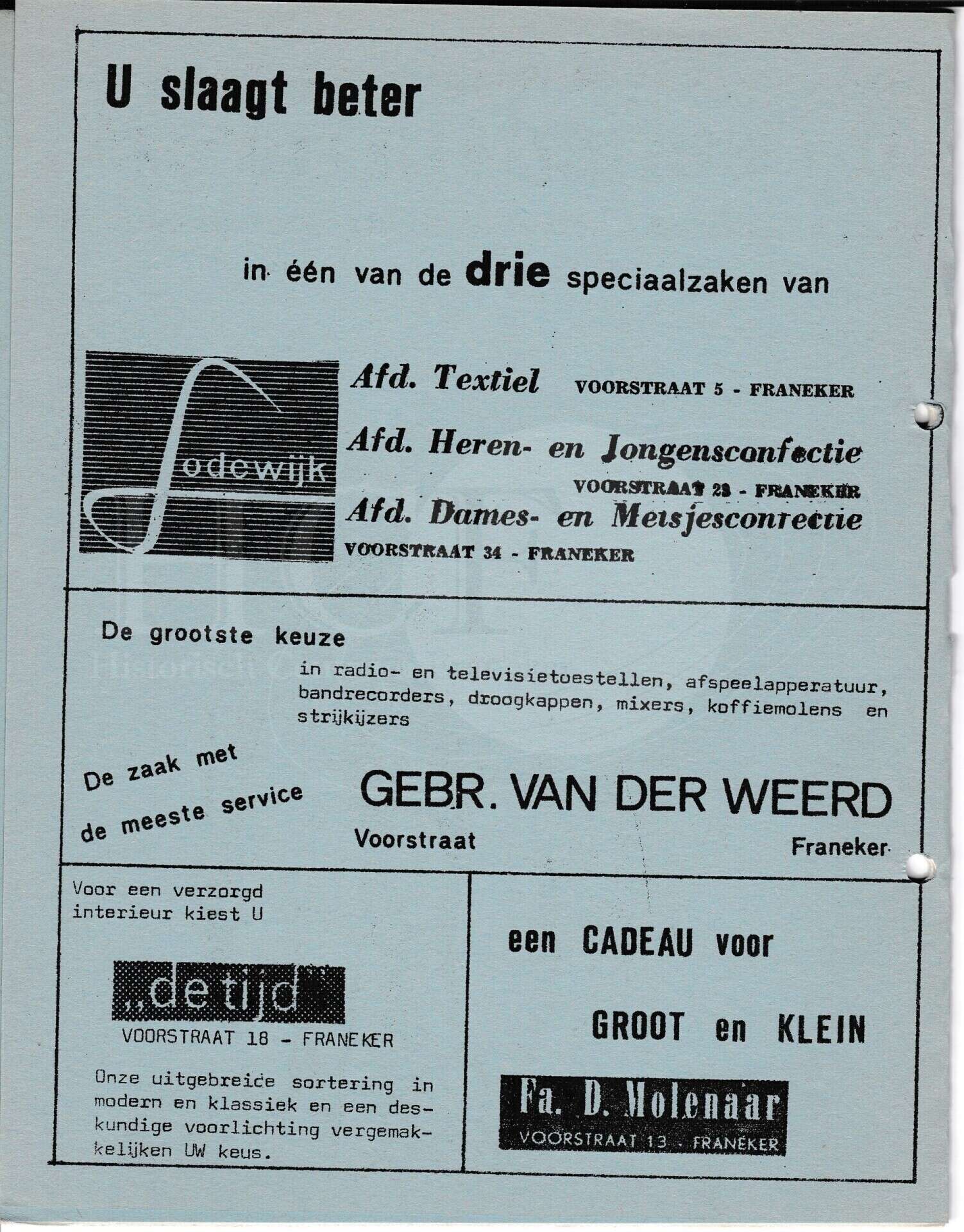 | Beschrijving: | It Fleurige Flittergat: 1966 2de jaargang nr. 22: Reklame; Lodewijk Textiel en kleding Voorstraat 5,23 en 34, Gebr. Van der Weert Voorstraat 25, Woning inrichting "De Tijd" Voorstraat 18, Fa.D.Molenaar Voorstaat 13 |