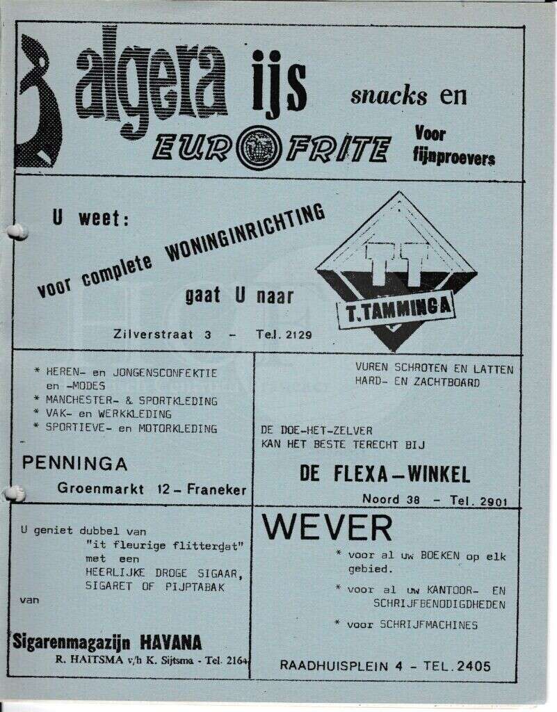 | Beschrijving: | It Fleurige Flittergat: 1966 2de jaargang nr. 22: Reklame; Cafetaria Algera Waagstraat 22, Woninginrichting T.Tamminga Zilverstraat 3, Herenmode Penninga Groenmarkt 12, De Flexa Noord 38, Sigarenmagazijn"Havana" K.Sijtsma Voorstraat 12, Boekhandel Wever Raadhuisplein 4 |