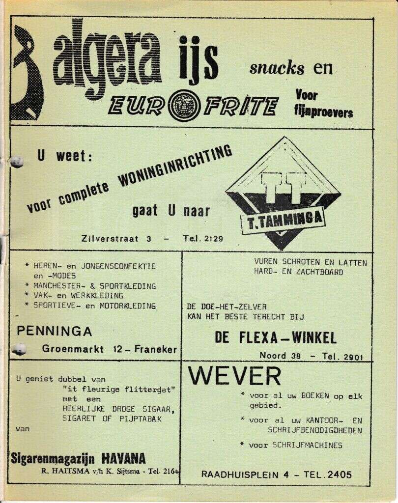 | Beschrijving: | It Fleurige Flittergat: 1966 2de jaargang nr. 23:Reklame; Cafetaria Algera Waagstraat 22, Woninginrichting T.Tamminga Zilverstraat 3, Herenmode Penninga Groenmarkt 12, De Flexa Noord 38, Sigarenmagazijn"Havana" K.Sijtsma Voorstraat 12, Boekhandel Wever Raadhuisplein 4 |