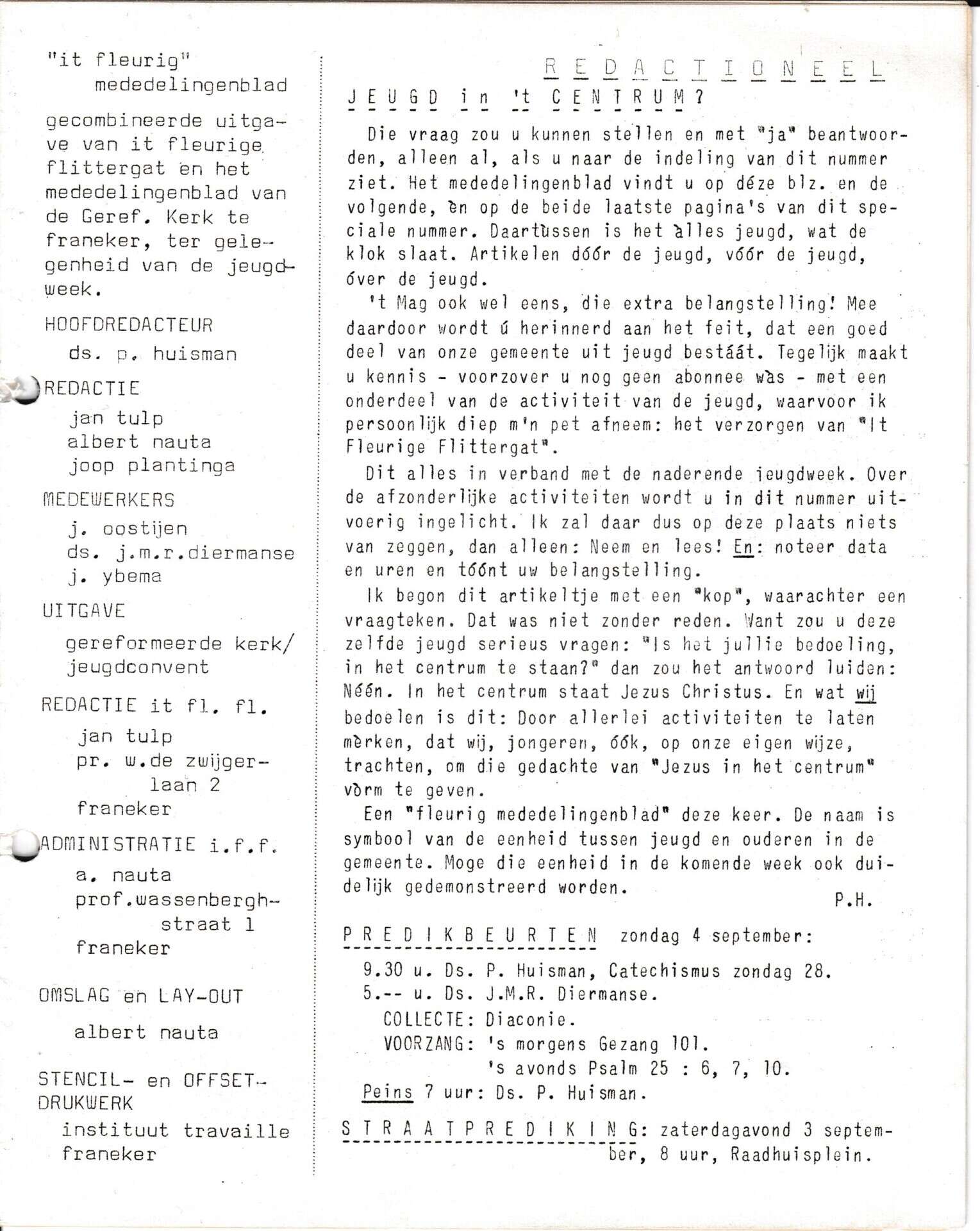 | Beschrijving: | It Fleurige Flittergat: 1966 3de jaargang nr. 0; Mededelingenblad; Redactioneel; Jeugd in het centrum? |