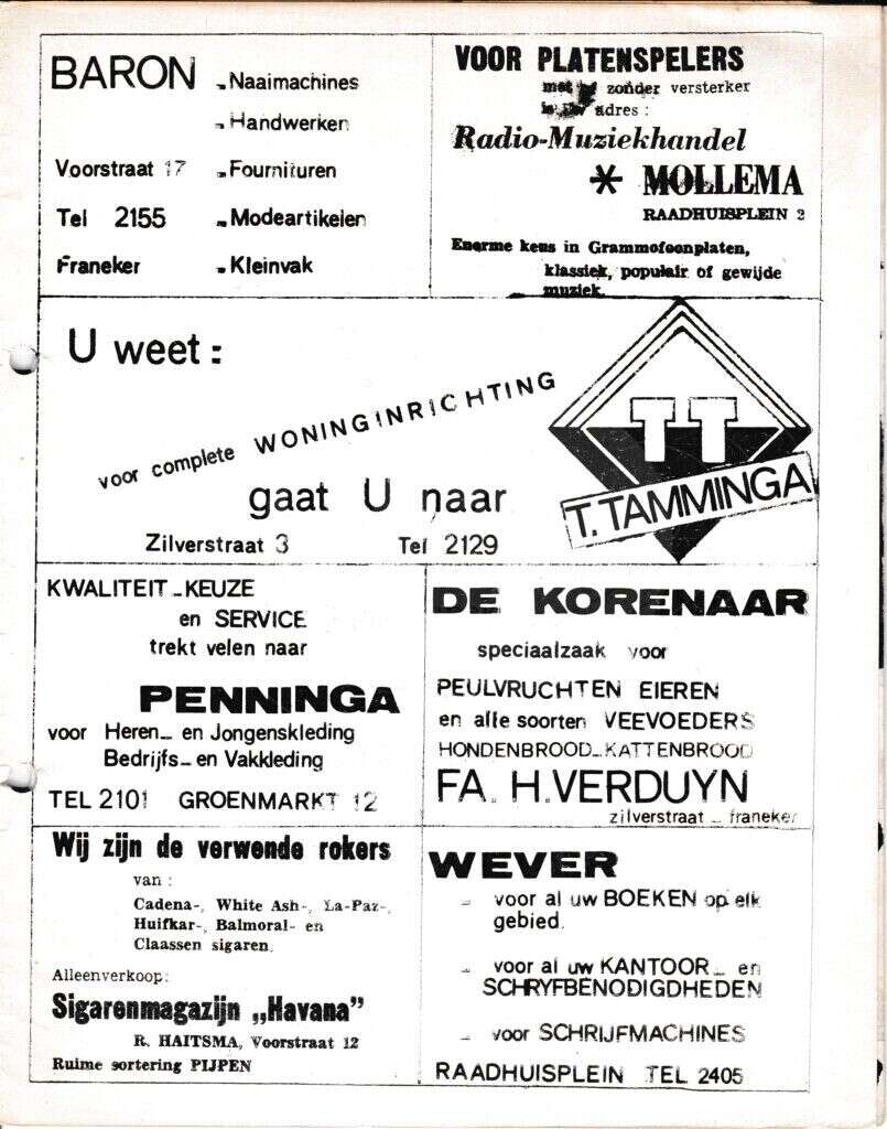 | Beschrijving: | It Fleurige Flittergat: 1966 3de jaargang nr. 0; Mededelingenblad; Reklame; Baron naaimachines Voorstraat 17, Radio en muziekhandel Mollema Raadhuisplein 2, Woninginrichting T.Tamminga Zilverstraat 3, Herenmode Penninga Groenmarkt 12, De Korenaar, zilverstraat 58, Sigarenmagazijn"Havana" K.Sijtsma Voorstraat 12, Boekhandel Wever Raadhuisplein 4 |