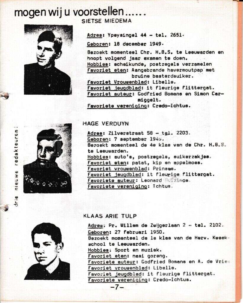 Beschrijving:It Fleurige Flittergat: 1966 3de jaargang nr. 1: Drie nieuwe redacteuren: Hage verduijn, Sietse Miedema, Klaas Arie Tulp.