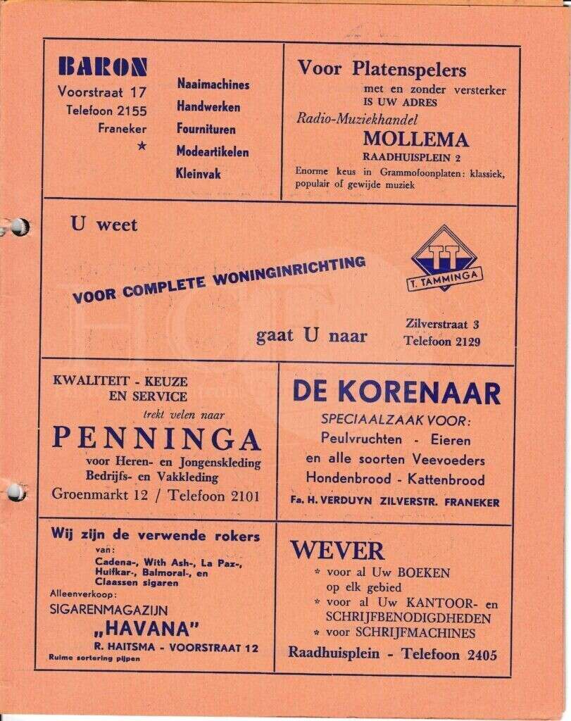 | Beschrijving: | It Fleurige Flittergat: 1966 3de jaargang nr. 1: Baron naaimachines Voorstraat 17, Radio-muziekhandel Mollema Raadhuisplein 2 , Woninginrichting T.Tamminga Zilverstraat 3, Herenmode Penninga Groenmarkt 12, De Korenaar, zilverstraat 58, Sigarenmagazijn"Havana" K.Sijtsma Voorstraat 12, Boekhandel Wever Raadhuisplein 4 |