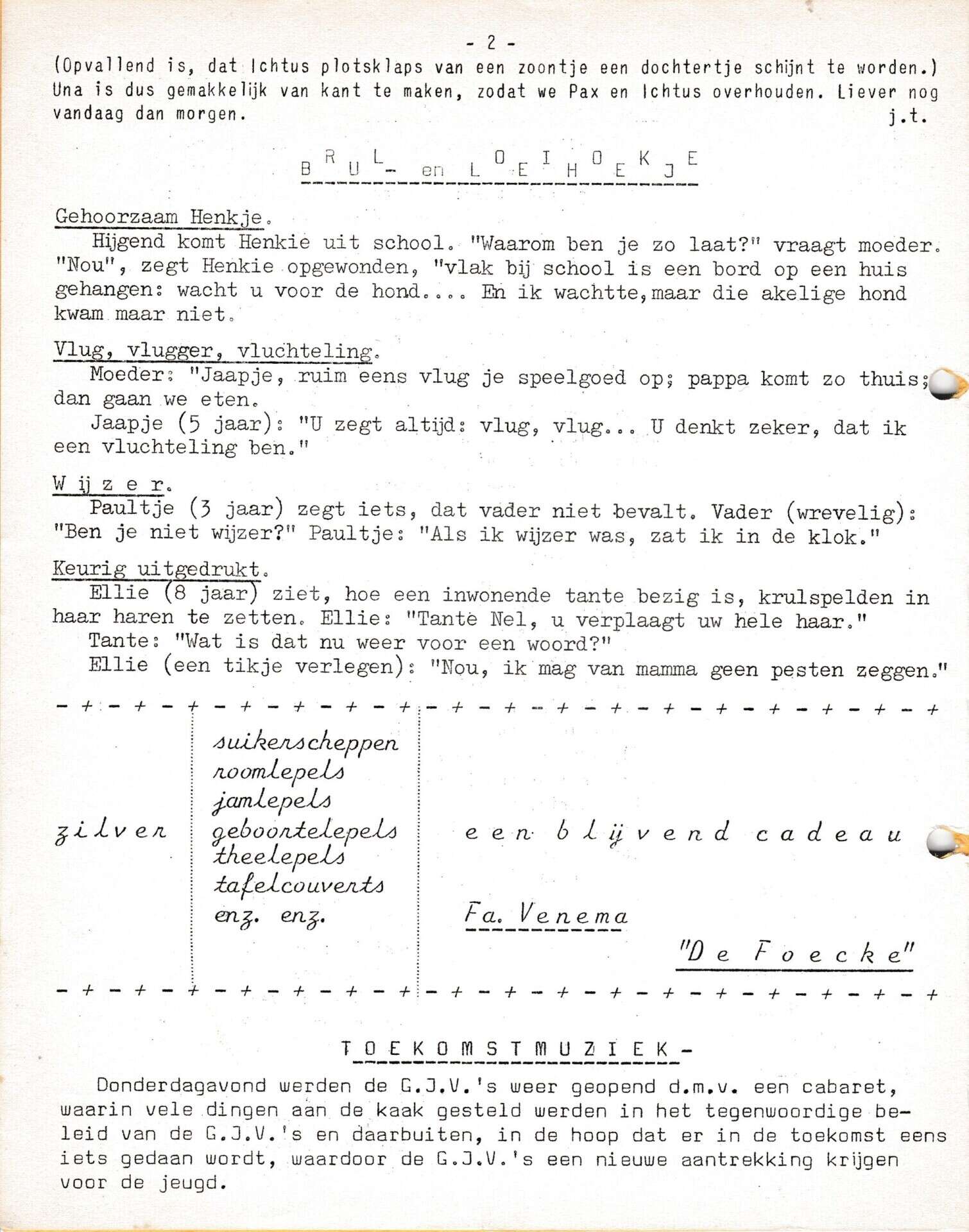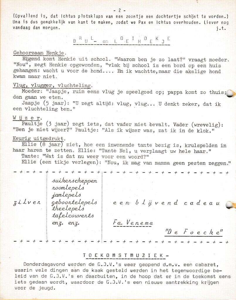 | Beschrijving: | It Fleurige Flittergat: 1966 3de jaargang nr. 2: vervolg Redactioneel; C.J.V van drie naar twee!, Brul en Loei hoekje, Reklame; Juwelier Venema "De Foeke" Voorstraat 4. |