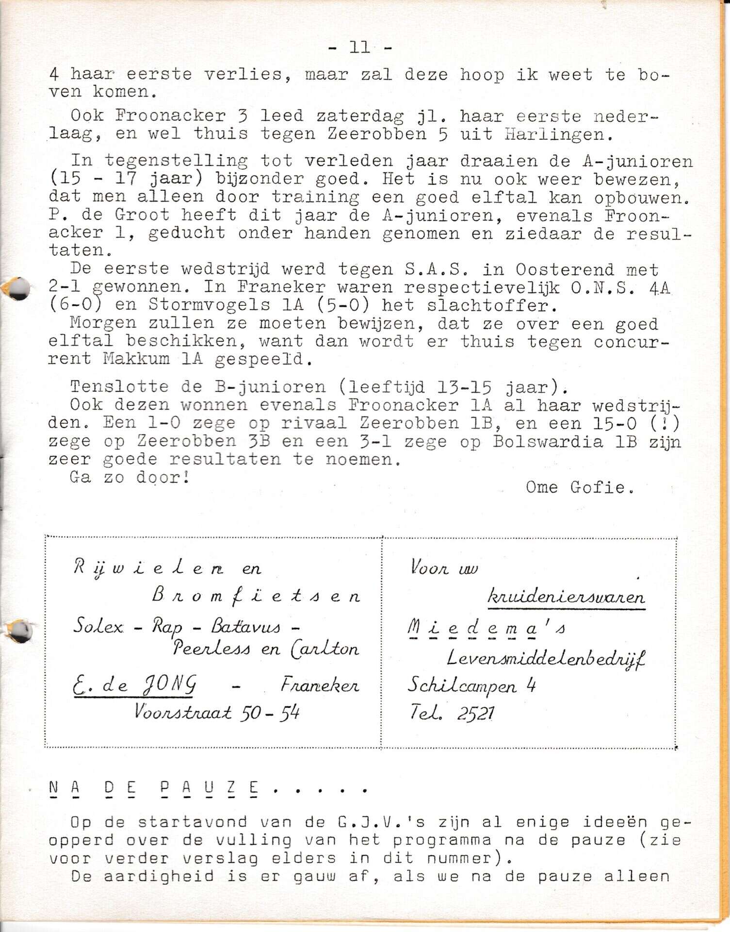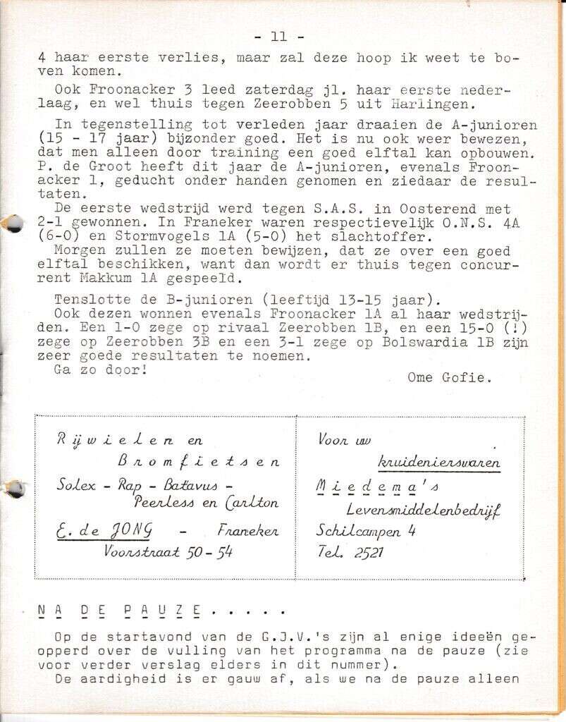 Beschrijving:It Fleurige Flittergat: 1966 3de jaargang nr. 2: vervolg Sportpraatje; V.V. Froonacker, Reklame; E.de Jong rijwielen en bromfietsen Voorstraat 50-54, Miedema Kruidenier Schilcampen 4, vervolg Redactioneel; C.J.V van drie naar twee!