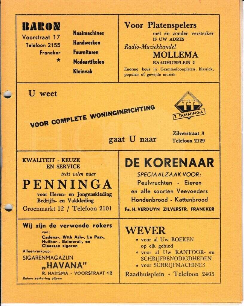| Beschrijving: | It Fleurige Flittergat: 1966 3de jaargang nr. 2: Reklame; Baron naaimachines Voorstraat 17, Radio-muziekhandel Mollema Raadhuisplein 2 , Woninginrichting T.Tamminga Zilverstraat 3, Herenmode Penninga Groenmarkt 12, De Korenaar, zilverstraat 58, Sigarenmagazijn"Havana" K.Sijtsma Voorstraat 12, Boekhandel Wever Raadhuisplein 4 |
