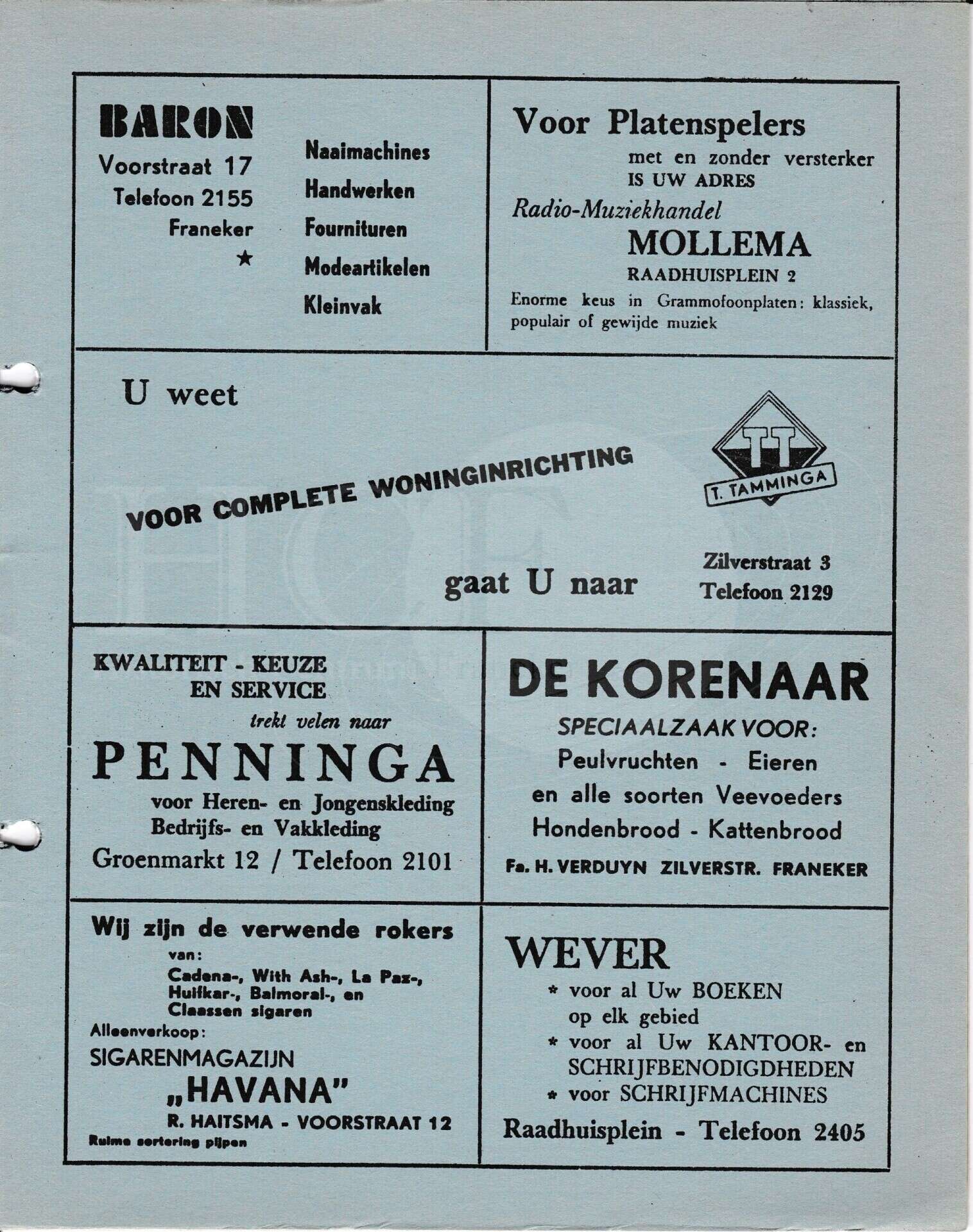 | Beschrijving: | It Fleurige Flittergat: 1966 3de jaargang nr. 3: Reklame; Baron naaimachines Voorstraat 17, Radio-muziekhandel Mollema Raadhuisplein 2 , Woninginrichting T.Tamminga Zilverstraat 3, Herenmode Penninga Groenmarkt 12, De Korenaar, zilverstraat 58, Sigarenmagazijn"Havana" K.Sijtsma Voorstraat 12, Boekhandel Wever Raadhuisplein 4 |