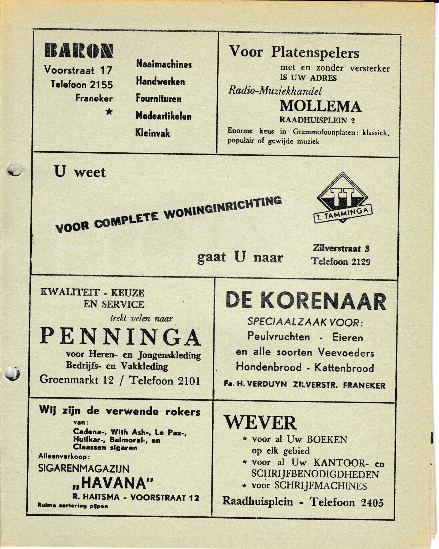 | Beschrijving: | It Fleurige Flittergat: 1966 3de jaargang nr. 5: Reklame; Baron naaimachines Voorstraat 17, Radio-muziekhandel Mollema Raadhuisplein 2 , Woninginrichting T.Tamminga Zilverstraat 3, Herenmode Penninga Groenmarkt 12, De Korenaar, zilverstraat 58, Sigarenmagazijn"Havana" K.Sijtsma Voorstraat 12, Boekhandel Wever Raadhuisplein 4 |