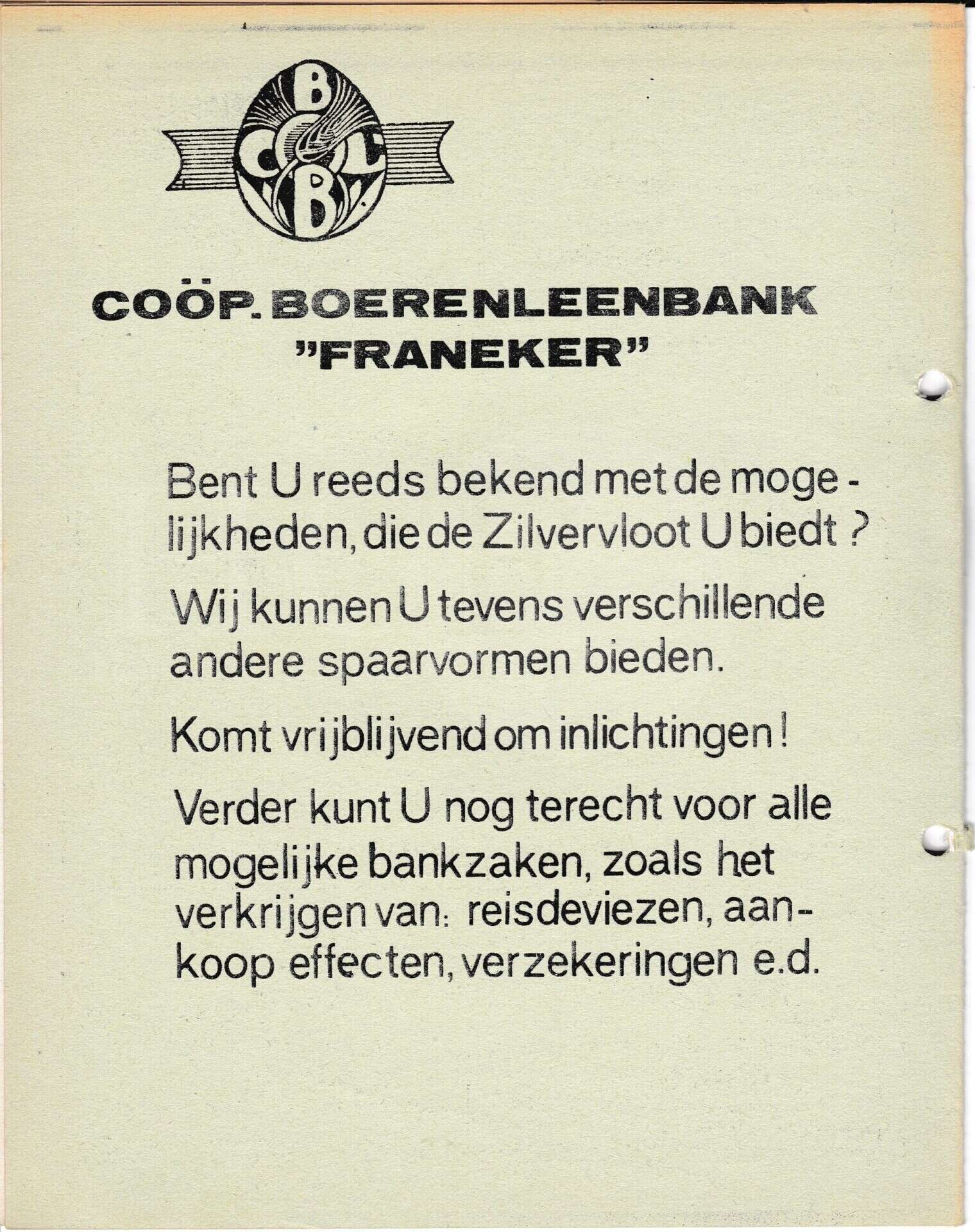 | Beschrijving: | It Fleurige Flittergat: 1966 3de jaargang nr. 5: Reklame: Coöperatieve Boerenleenbank Franeker |