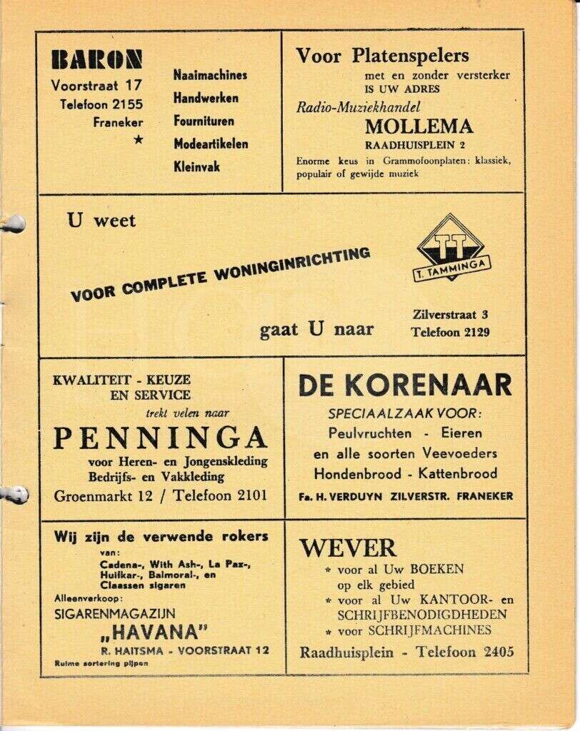 | Beschrijving: | It Fleurige Flittergat: 1966 3de jaargang nr. 6: Reklame; Baron naaimachines Voorstraat 17, Radio-muziekhandel Mollema Raadhuisplein 2 , Woninginrichting T.Tamminga Zilverstraat 3, Herenmode Penninga Groenmarkt 12, De Korenaar, zilverstraat 58, Sigarenmagazijn"Havana" K.Sijtsma Voorstraat 12, Boekhandel Wever Raadhuisplein 4 |