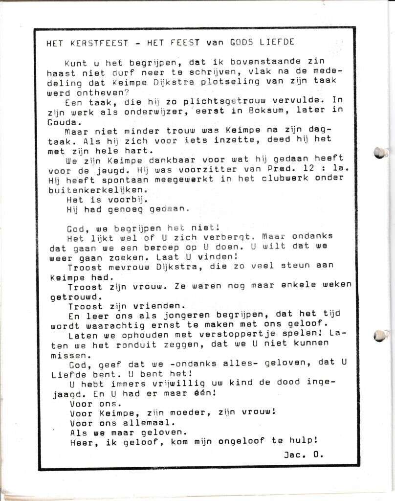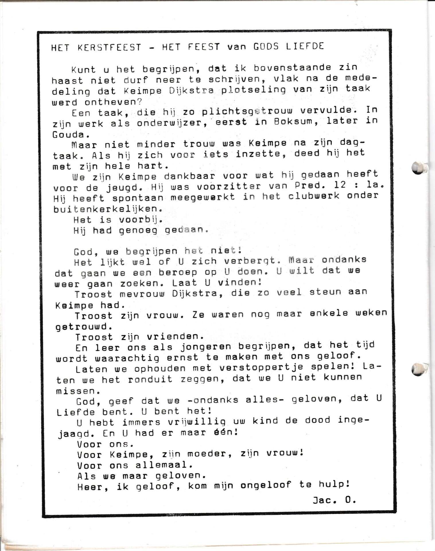 Beschrijving:It Fleurige Flittergat: 1966 3de jaargang nr. 8 kerst: in memoriam: Keimpe Dijkstra (Jac. O)