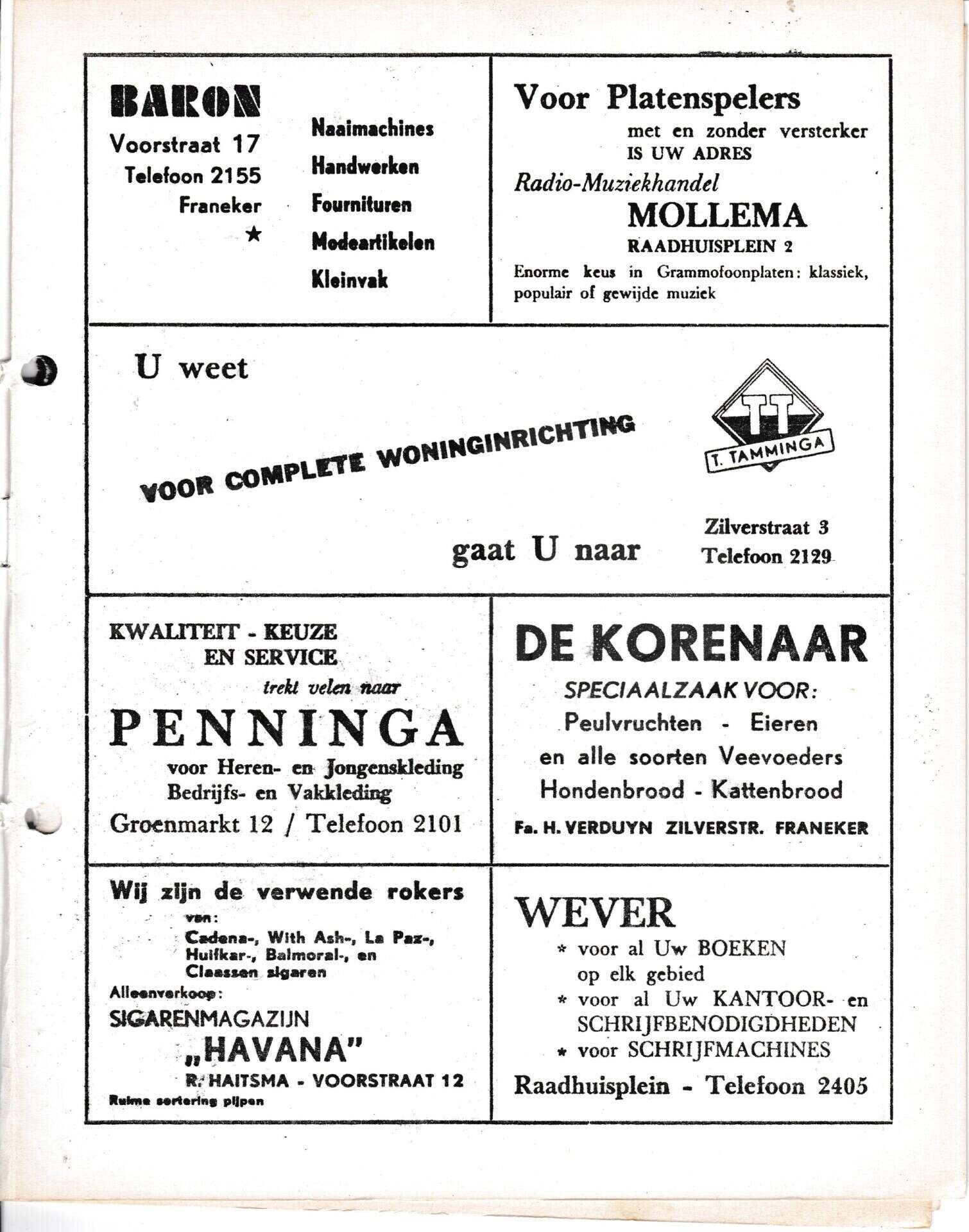 | Beschrijving: | It Fleurige Flittergat: 1966 3de jaargang nr. 8 kerst: Reklame; Baron naaimachines Voorstraat 17, Radio-muziekhandel Mollema Raadhuisplein 2 , Woninginrichting T.Tamminga Zilverstraat 3, Herenmode Penninga Groenmarkt 12, De Korenaar, zilverstraat 58, Sigarenmagazijn"Havana" K.Sijtsma Voorstraat 12, Boekhandel Wever Raadhuisplein 4 |