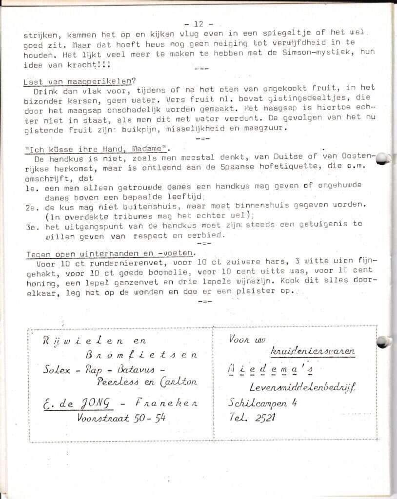 | Beschrijving: | It Fleurige Flittergat:1967 3de jaargang nr. 9: vervolg Uit de Knopenbus (voorheen Vrouwenpraat en daarna De Tondeldoos), Reklame; E.de Jong rijwielen en bromfietsen Voorstraat 50-54, Miedema Kruidenier Schilcampen 4 |