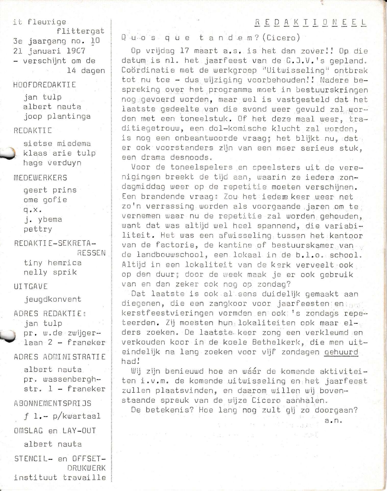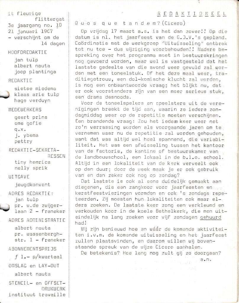 | Beschrijving: | It Fleurige Flittergat: 1967 3de jaargang nr. 10: Redactioneel G.J.V jaarfeest. |