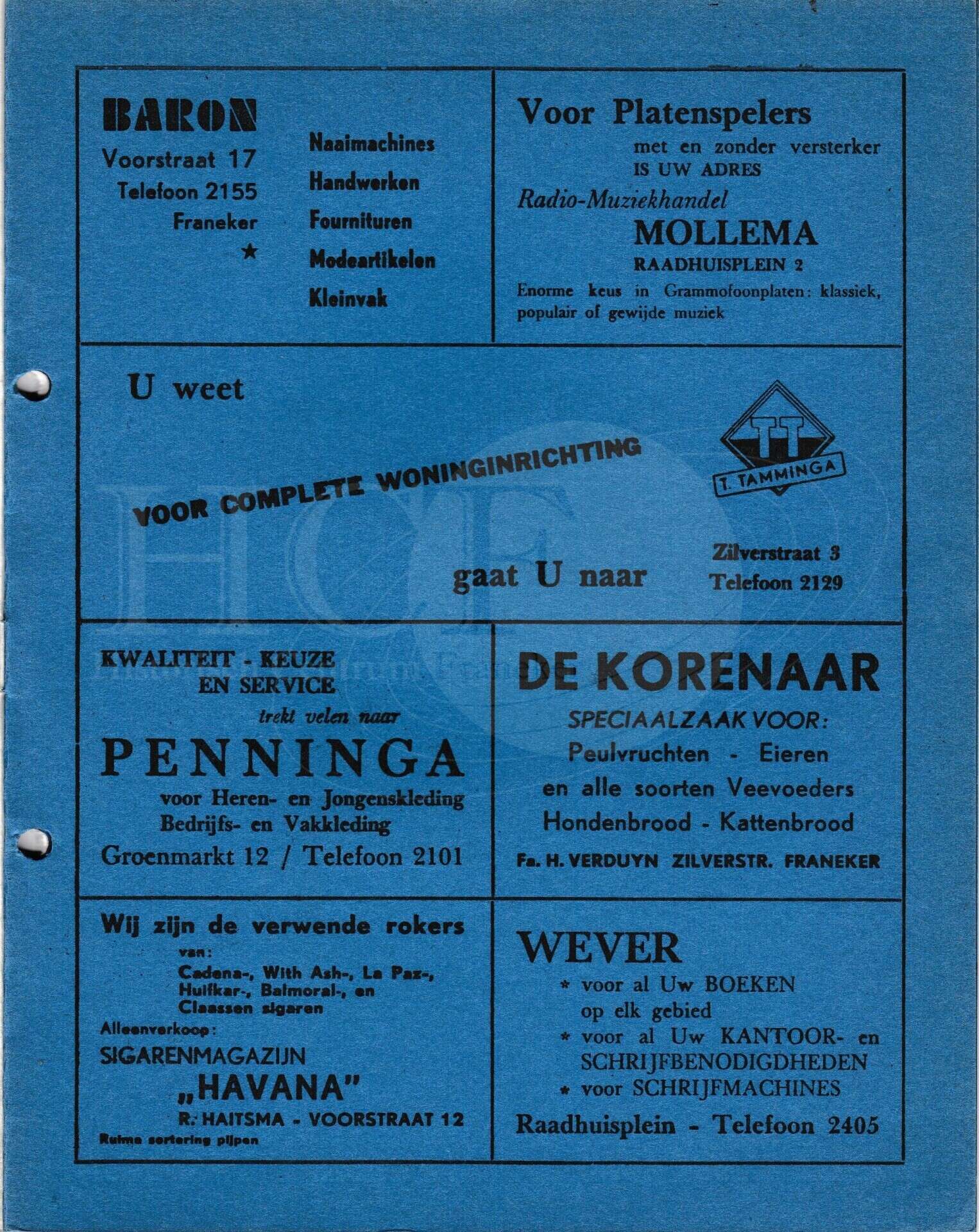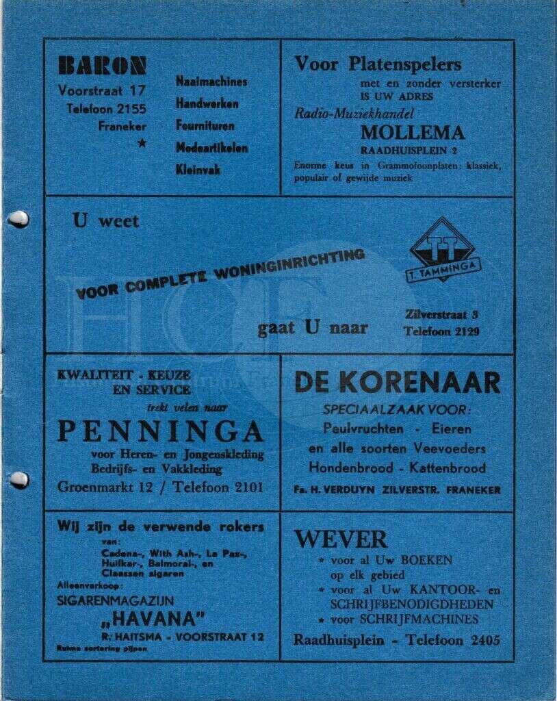 | Beschrijving: | It Fleurige Flittergat: 1967 3de jaargang nr. 11: Reklame; Baron naaimachines Voorstraat 17, Radio-muziekhandel Mollema Raadhuisplein 2 , Woninginrichting T.Tamminga Zilverstraat 3, Herenmode Penninga Groenmarkt 12, De Korenaar, zilverstraat 58, Sigarenmagazijn"Havana" K.Sijtsma Voorstraat 12, Boekhandel Wever Raadhuisplein 4 |