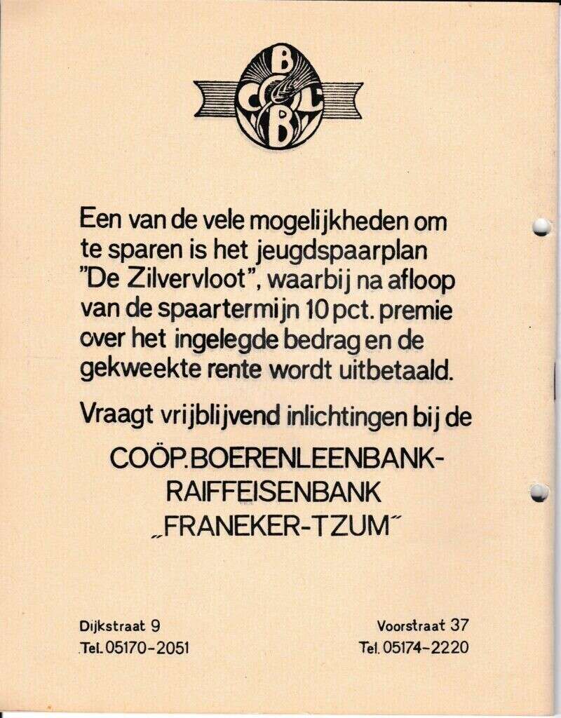 | Beschrijving: | It Fleurige Flittergat: 1967 3de jaargang nr. 14: Coöperatieve Boerenleenbank Franeker, Zilvervloot sparen |