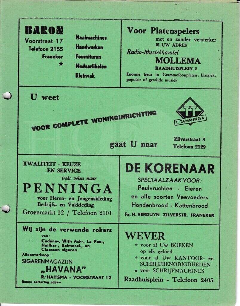 | Beschrijving: | It Fleurige Flittergat: 1967 3de jaargang nr. 15: Reklame; Baron naaimachines Voorstraat 17, Radio-muziekhandel Mollema Raadhuisplein 2 , Woninginrichting T.Tamminga Zilverstraat 3, Herenmode Penninga Groenmarkt 12, De Korenaar, zilverstraat 58, Sigarenmagazijn"Havana" K.Sijtsma Voorstraat 12, Boekhandel Wever Raadhuisplein 4 |