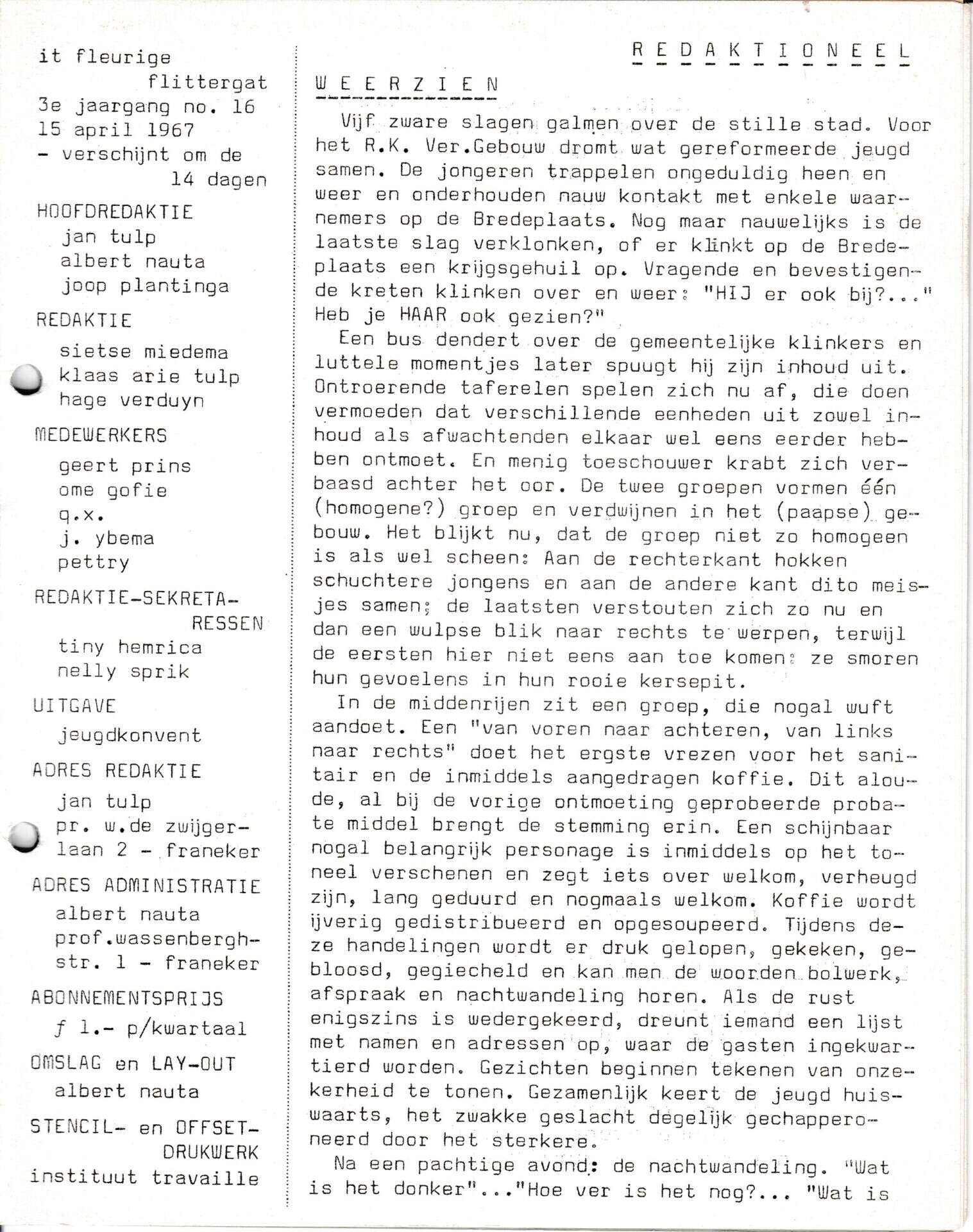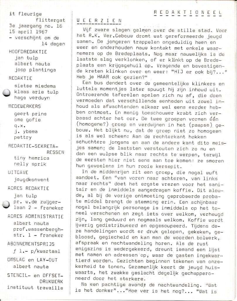 Beschrijving:It Fleurige Flittergat: 1967 3de jaargang nr. 16: Redactioneel; Uitwisselingsweekend Weerzien