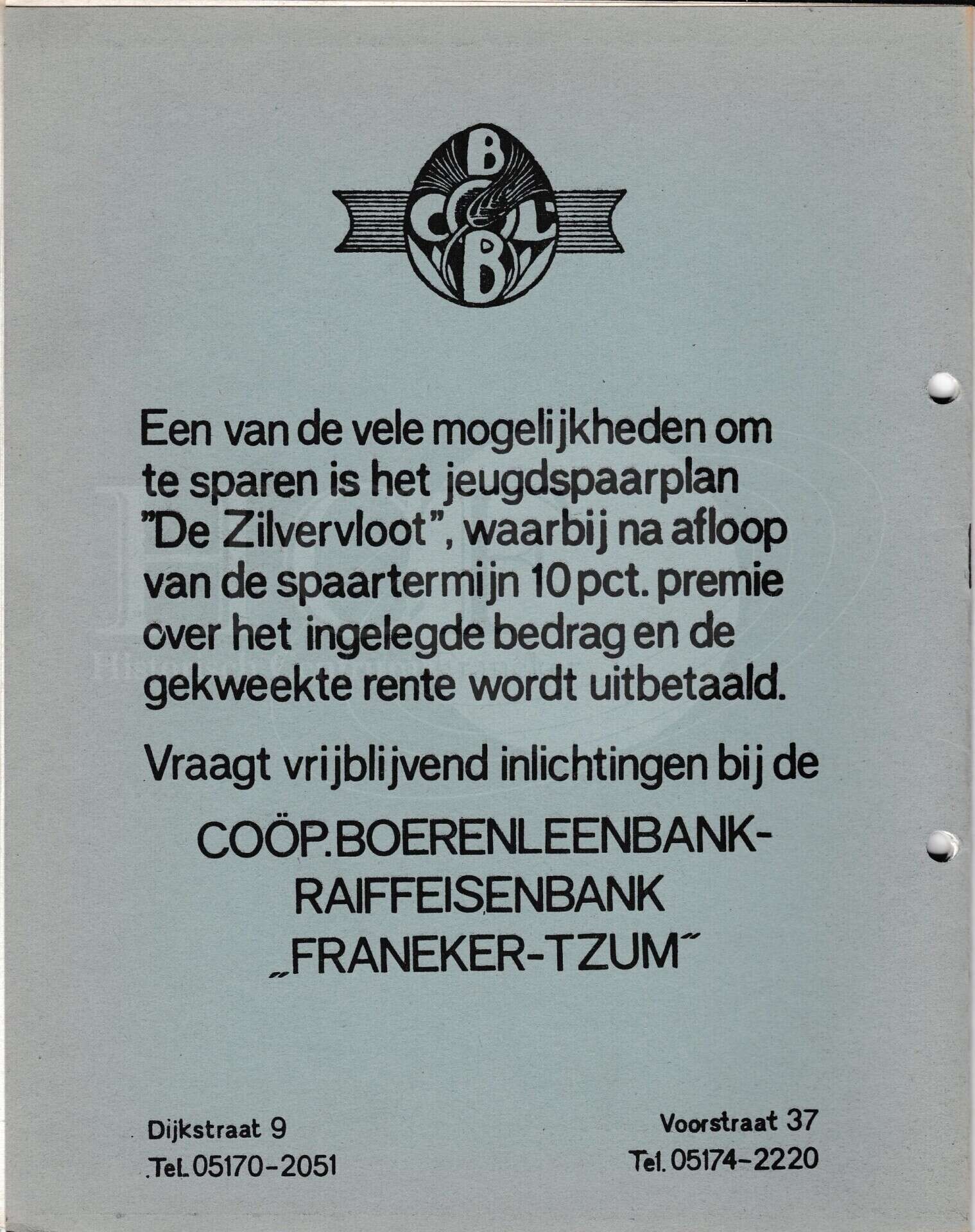 | Beschrijving: | It Fleurige Flittergat: 1967 3de jaargang nr. 16: Coöperatieve Boerenleenbank Franeker, Zilvervloot sparen |