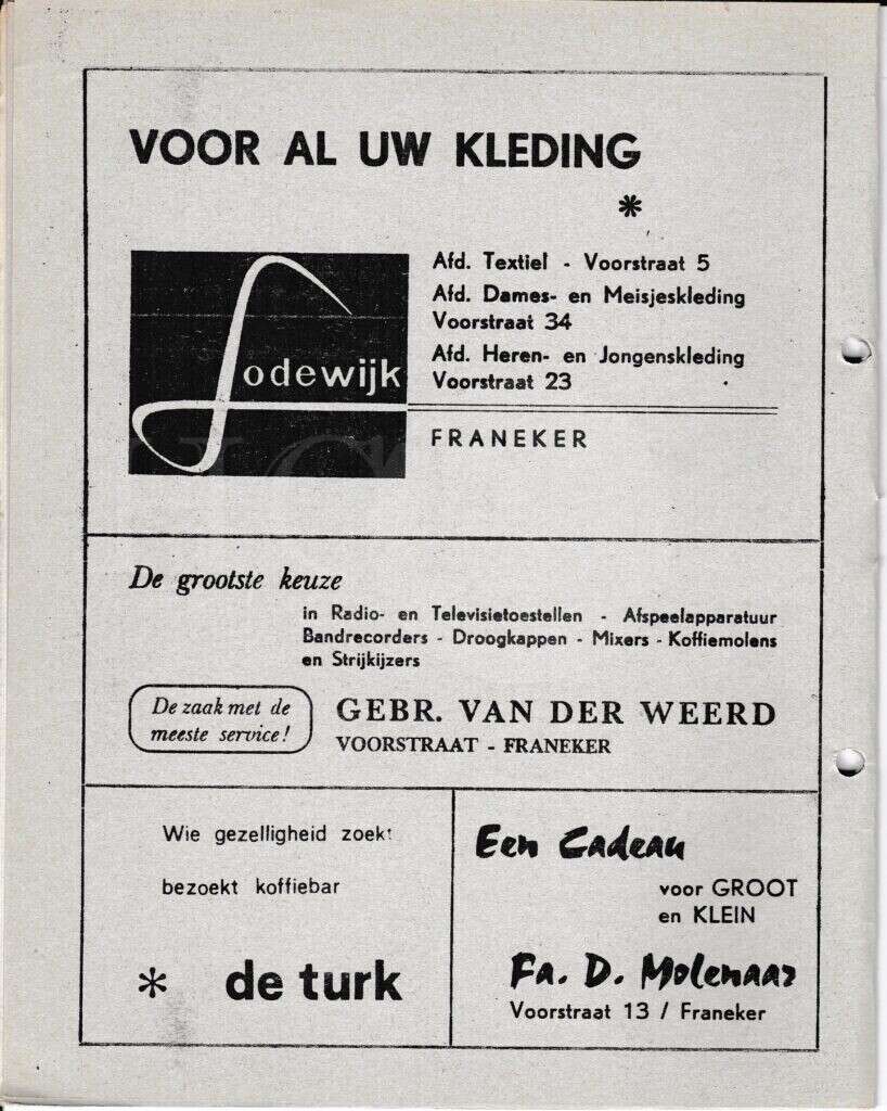 | Beschrijving: | It Fleurige Flittergat: 1967 3de jaargang nr. 17: Reklame; Lodewijk Textiel en kleding Voorstraat 5,23 en 34, Gebr. Van der Weert Voorstraat 25, Koffiebar De Turk, Fa.D.Molenaar Voorstaat 13 |