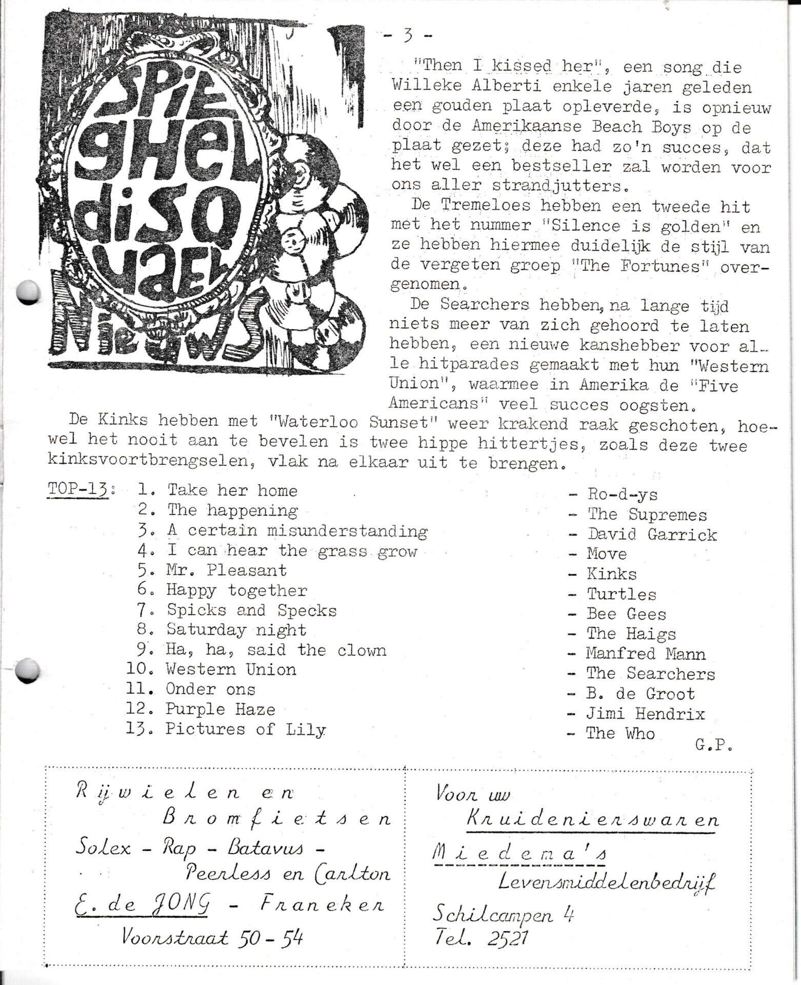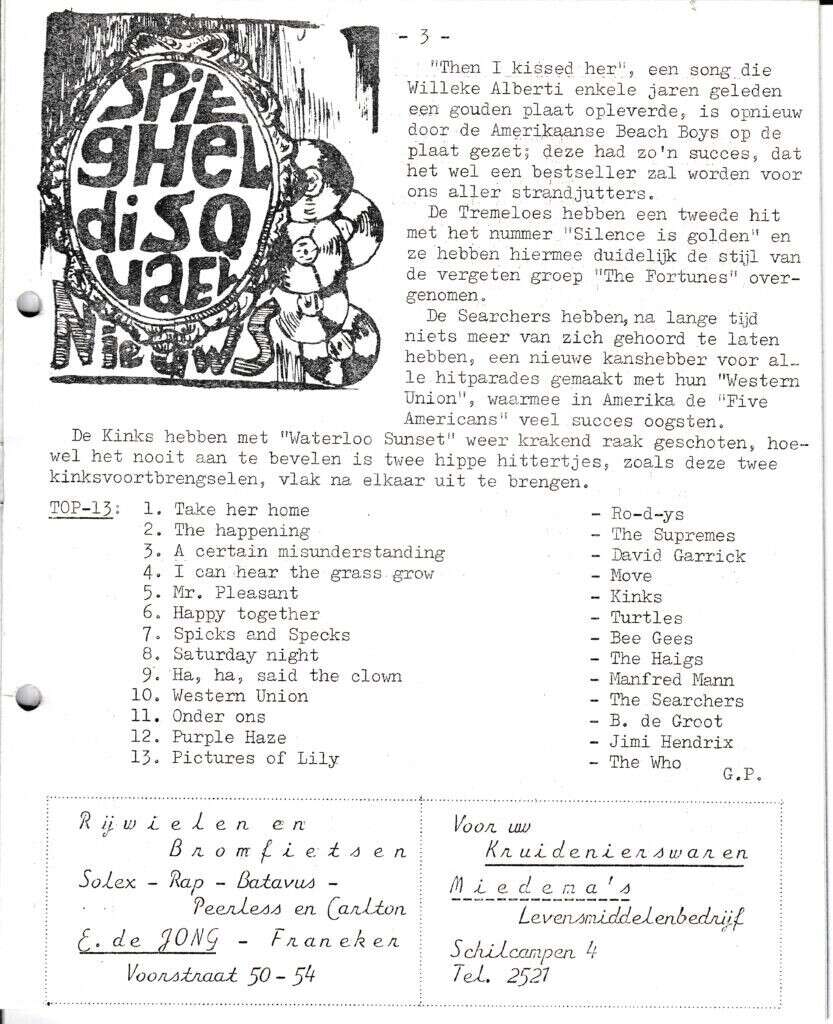 Beschrijving:It Fleurige Flittergat: 1967 3de jaargang nr. 20: Soosparade. Reklame; E.de Jong rijwielen en bromfietsen Voorstraat 50-54, Miedema Kruidenier Schilcampen 4