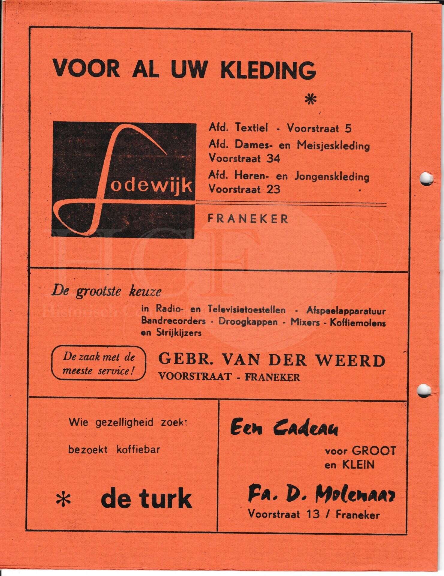 | Beschrijving: | It Fleurige Flittergat: 1967 3de jaargang nr. 21: Reklame; Lodewijk Textiel en kleding Voorstraat 5,23 en 34, Gebr. Van der Weert Voorstraat 25, Koffiebar De Turk, Fa.D.Molenaar Voorstaat 13 |