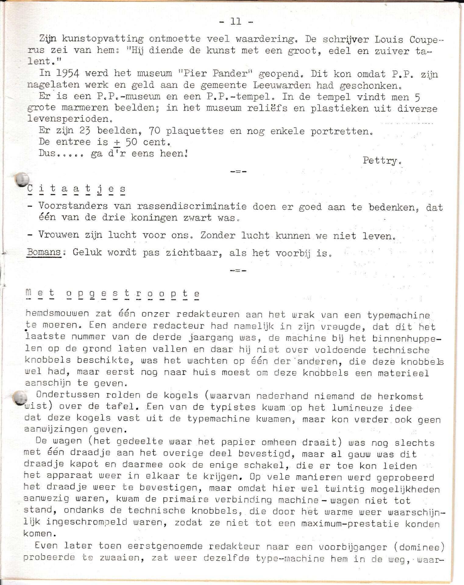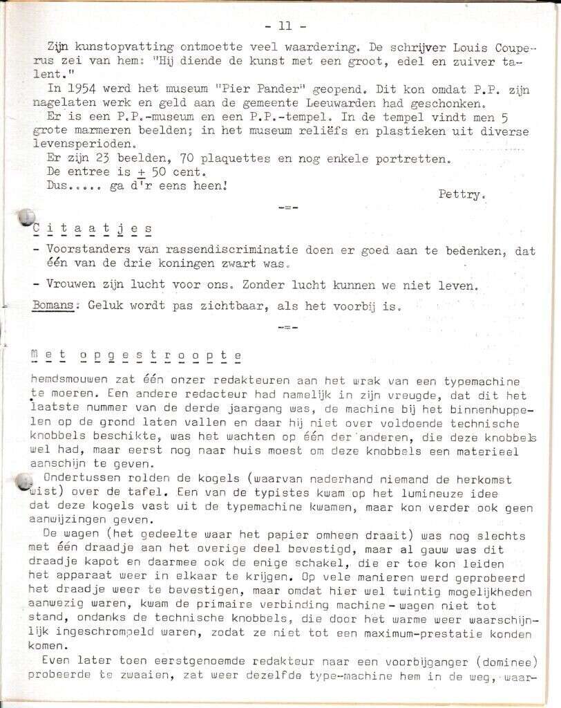 Beschrijving:It Fleurige Flittergat: 1967 3de jaargang nr. 22: vervolg Uit de Knopenbus (voorheen Vrouwenpraat en daarna De Tondeldoos) Pier Pander museum, Redacteuren en de typmachine