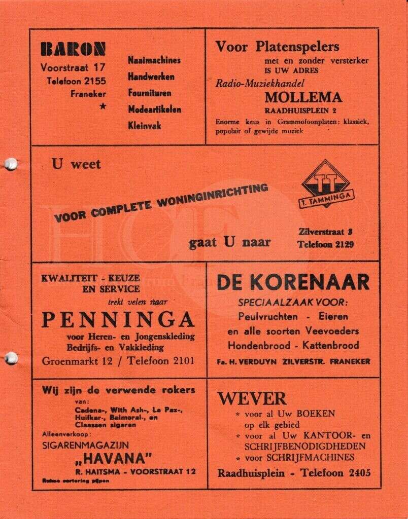 Beschrijving: | It Fleurige Flittergat: 1967 4de jaargang nr. 0: Jeugdweek: Reklame; Baron naaimachines Voorstraat 17, Radio-muziekhandel Mollema Raadhuisplein 2 , Woninginrichting T.Tamminga Zilverstraat 3, Herenmode Penninga Groenmarkt 12, De Korenaar, zilverstraat 58, Sigarenmagazijn"Havana" K.Sijtsma Voorstraat 12, Boekhandel Wever Raadhuisplein 4 |