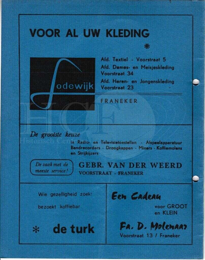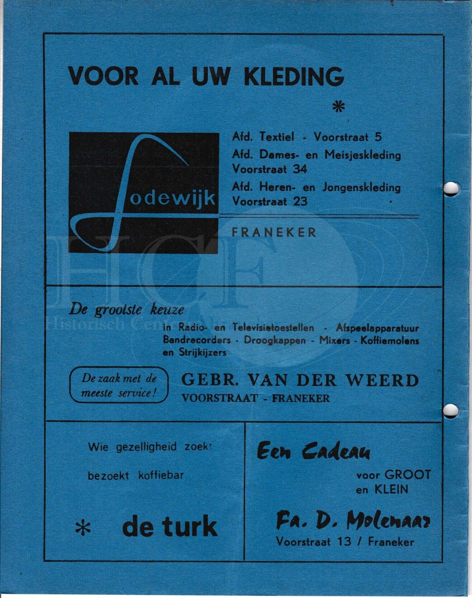 Beschrijving:It Fleurige Flittergat: 1967 4de jaargang nr. 1: Reklame; Lodewijk Textiel en kleding Voorstraat 5,23 en 34, Gebr. Van der Weert Voorstraat 25, Koffiebar De Turk, Fa.D.Molenaar Voorstaat 13