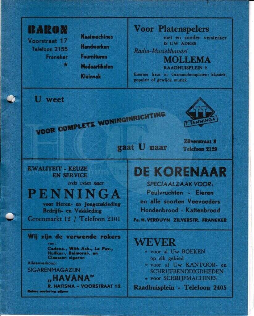 | Beschrijving: | It Fleurige Flittergat: 1967 4de jaargang nr. 1: Reklame; Baron naaimachines Voorstraat 17, Radio-muziekhandel Mollema Raadhuisplein 2 , Woninginrichting T.Tamminga Zilverstraat 3, Herenmode Penninga Groenmarkt 12, De Korenaar, zilverstraat 58, Sigarenmagazijn"Havana" K.Sijtsma Voorstraat 12, Boekhandel Wever Raadhuisplein 4 |