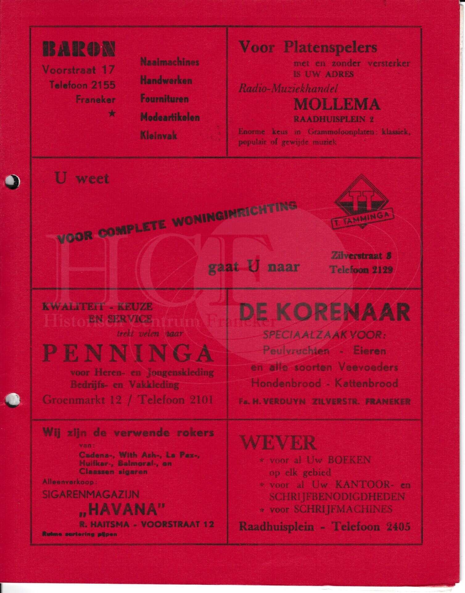 Beschrijving:It Fleurige Flittergat: 1967 4de jaargang nr. 2: Reklame; Baron naaimachines Voorstraat 17, Radio-muziekhandel Mollema Raadhuisplein 2 , Woninginrichting T.Tamminga Zilverstraat 3, Herenmode Penninga Groenmarkt 12, De Korenaar, zilverstraat 58, Sigarenmagazijn"Havana" K.Sijtsma Voorstraat 12, Boekhandel Wever Raadhuisplein 4