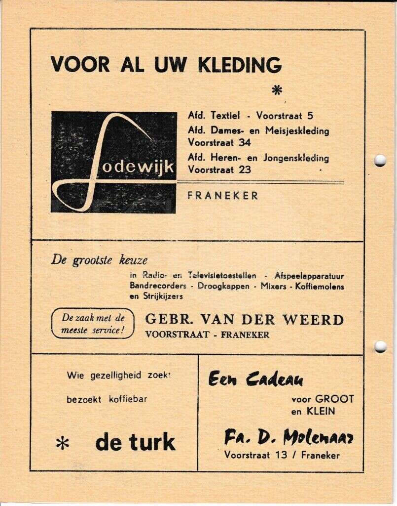 | Beschrijving: | It Fleurige Flittergat: 1967 4de jaargang nr. 3: Reklame; Lodewijk Textiel en kleding Voorstraat 5,23 en 34, Gebr. Van der Weert Voorstraat 25, Koffiebar De Turk, Fa.D.Molenaar Voorstaat 13 |