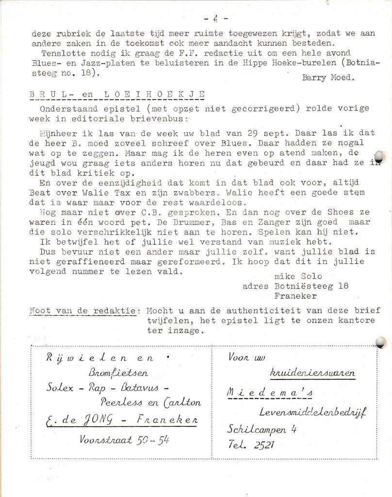 | Beschrijving: | It Fleurige Flittergat: 1967 4de jaargang nr. 3: Brul en Loei hoekje. Reklame; E.de Jong rijwielen en bromfietsen Voorstraat 50-54, Miedema Kruidenier Schilcampen 4 |