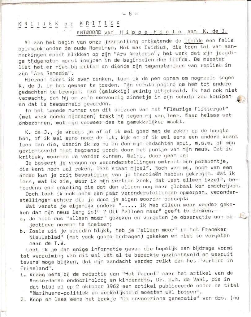 | Beschrijving: | It Fleurige Flittergat: 1967 4de jaargang nr. 3: Hippe Hiele; Kritiek op Kritiek. |