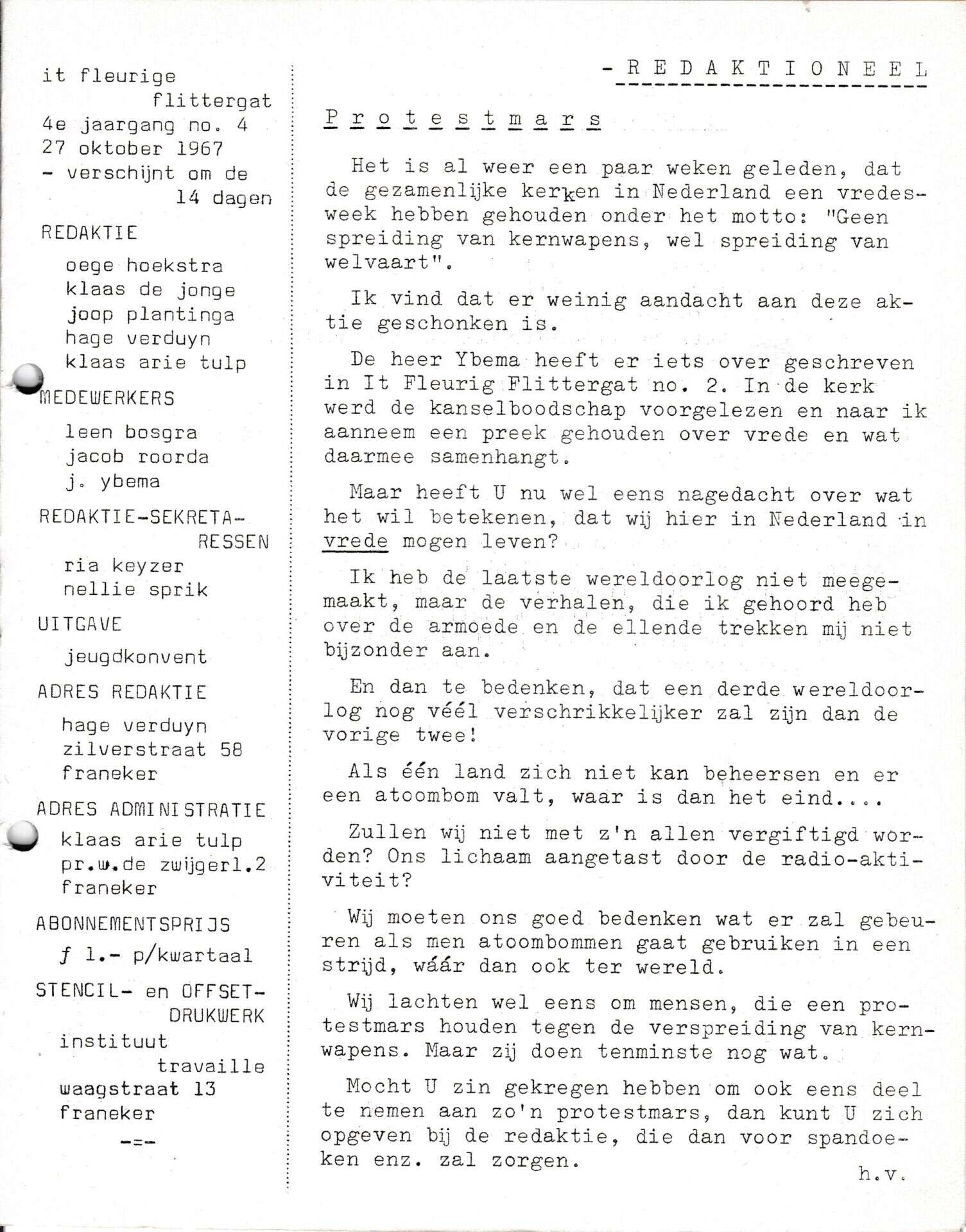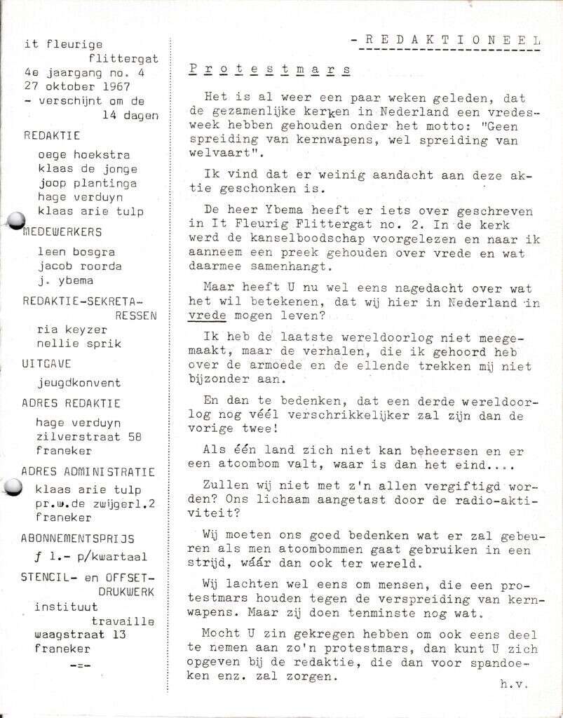 Beschrijving: | It Fleurige Flittergat: 1967 4de jaargang nr. 4: Redactioneel; Vredesweek, protestmars |