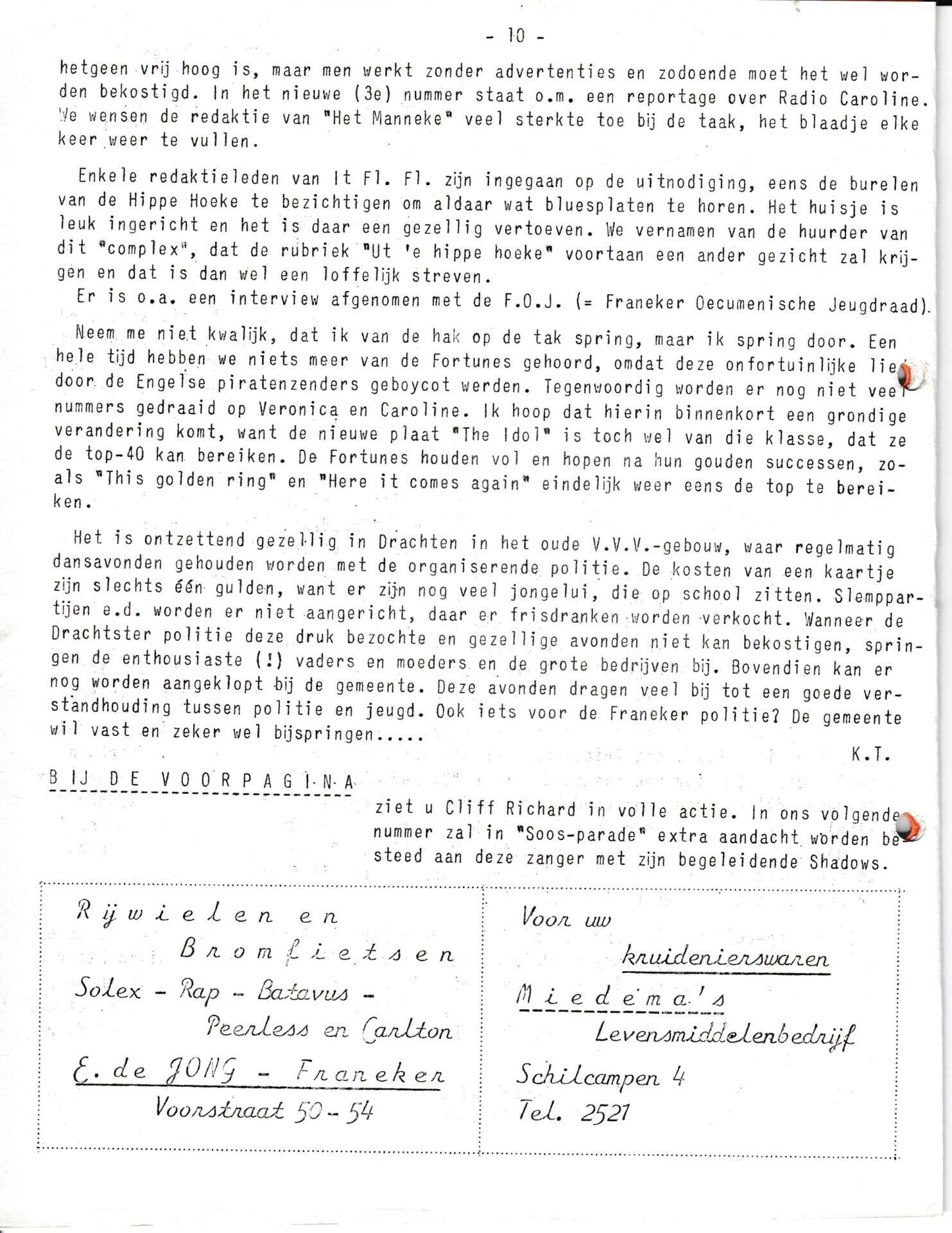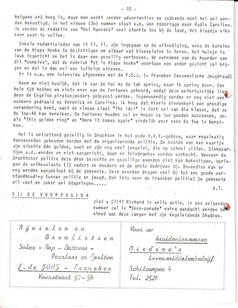 Beschrijving:It Fleurige Flittergat: 1967 4de jaargang nr. 5: vervolg Soosparade. Reklame; E.de Jong rijwielen en bromfietsen Voorstraat 50-54, Miedema Kruidenier Schilcampen 4