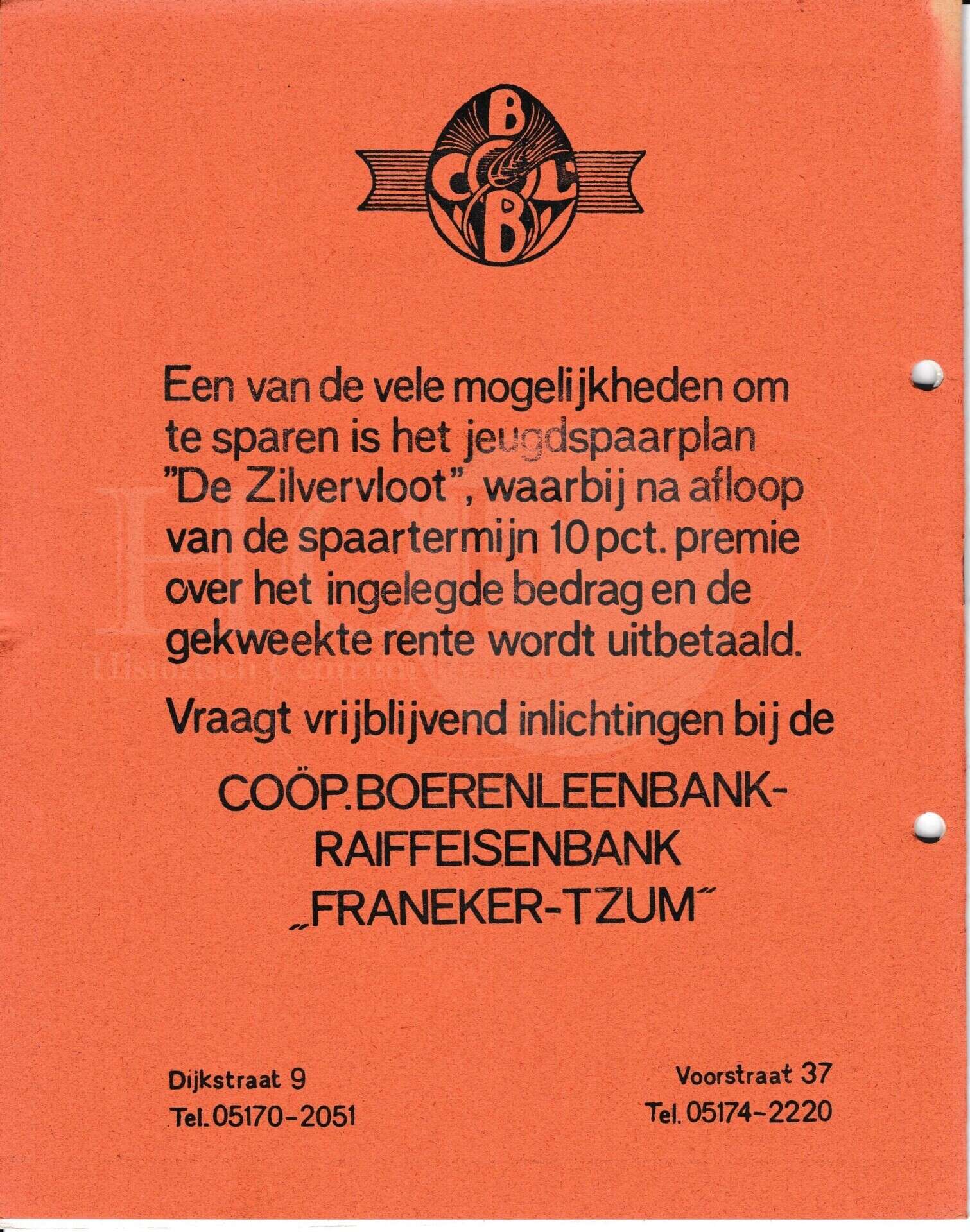 | Beschrijving: | It Fleurige Flittergat: 1967 4de jaargang nr. 5: Coöperatieve Boerenleenbank Franeker, Zilvervloot sparen |