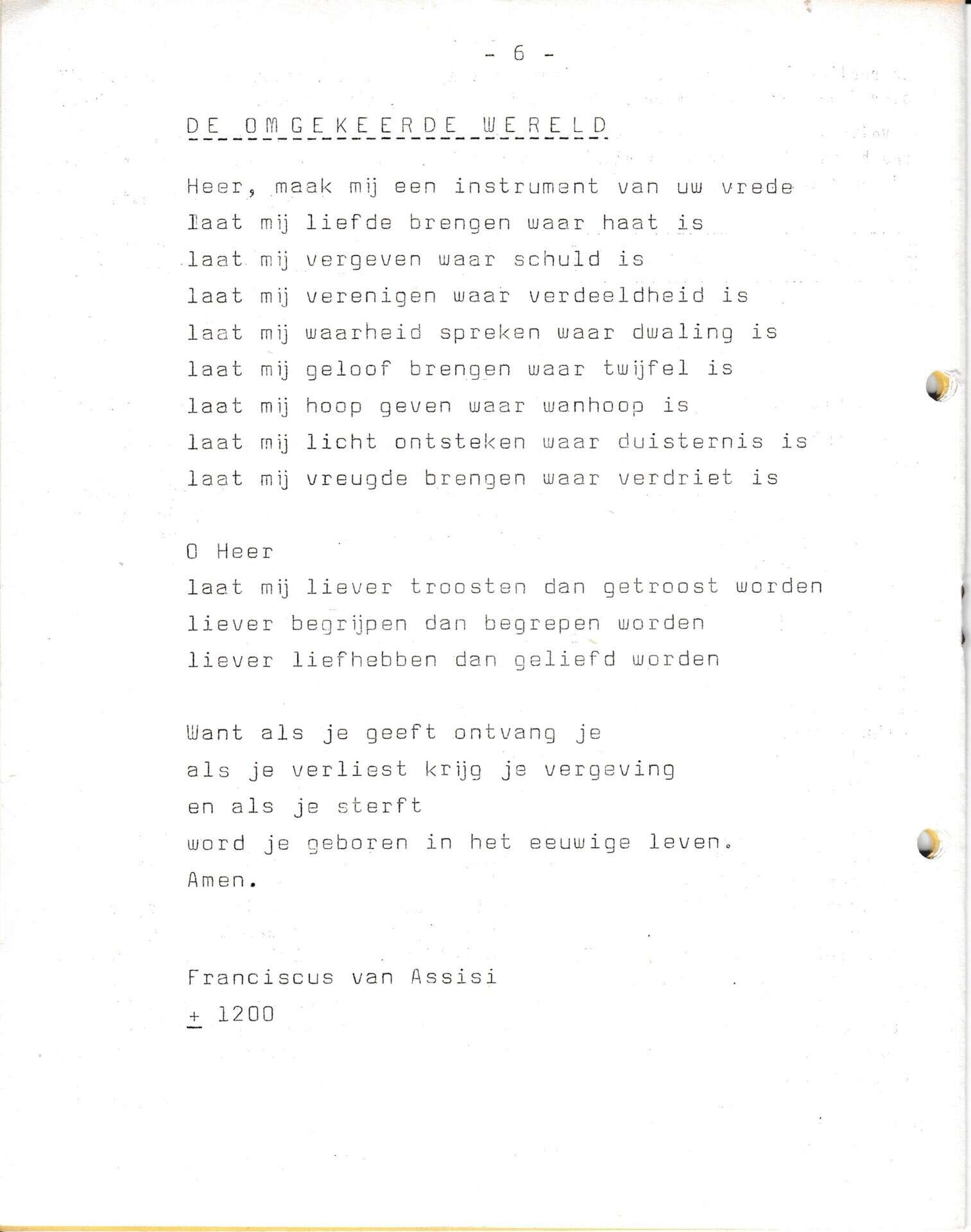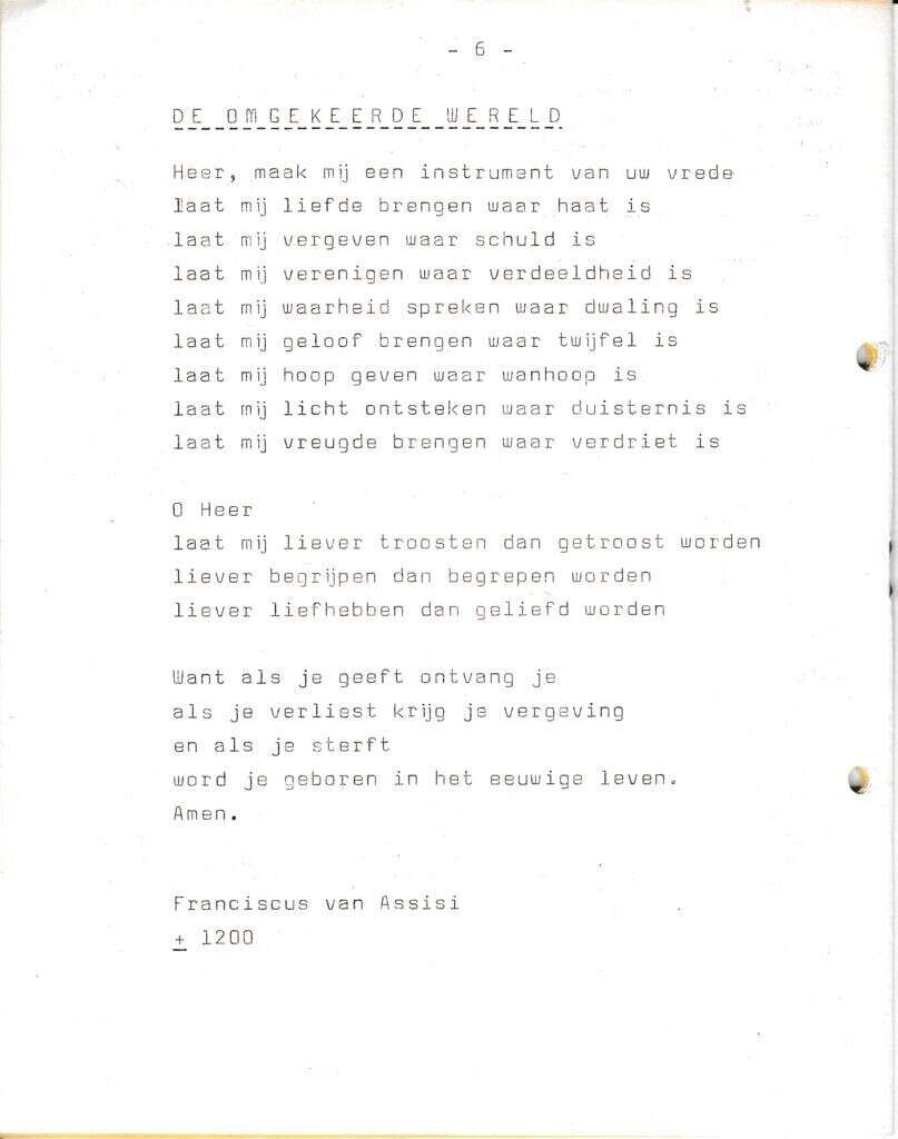 Beschrijving:It Fleurige Flittergat: 1967 4de jaargang nr. 6: Gebed: De omgekeerde wereld (Franciscus van Assisi)