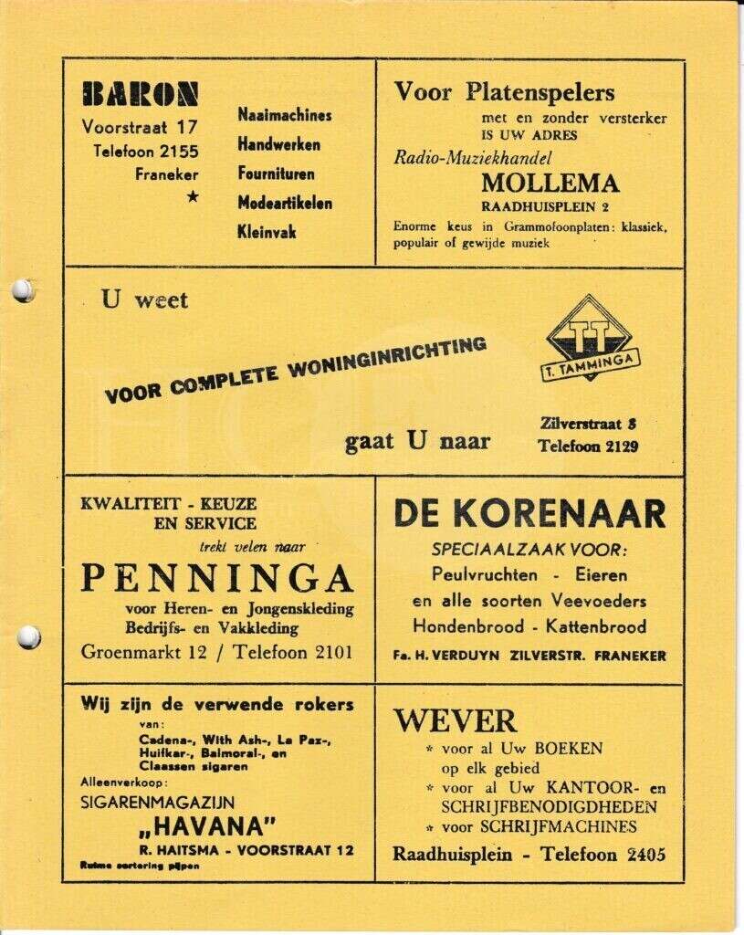 | Beschrijving: | It Fleurige Flittergat: 1967 4de jaargang nr. 6: Reklame; Baron naaimachines Voorstraat 17, Radio-muziekhandel Mollema Raadhuisplein 2 , Woninginrichting T.Tamminga Zilverstraat 3, Herenmode Penninga Groenmarkt 12, De Korenaar, zilverstraat 58, Sigarenmagazijn"Havana" K.Sijtsma Voorstraat 12, Boekhandel Wever Raadhuisplein 4 |