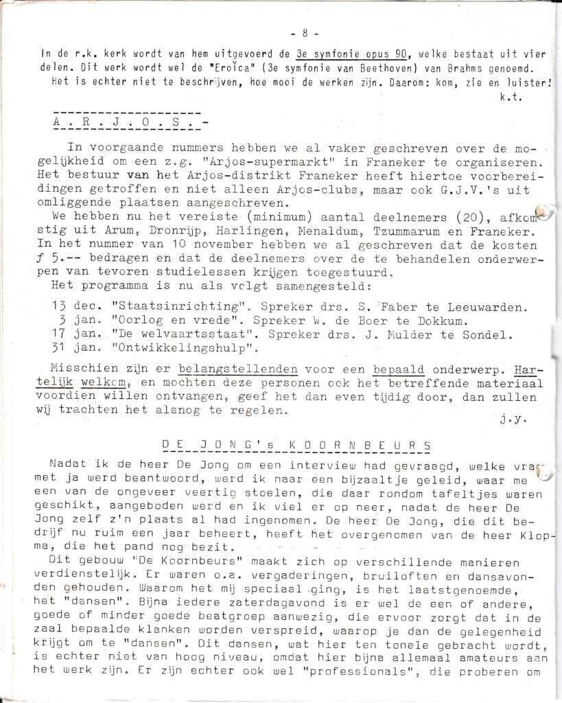 | Beschrijving: | It Fleurige Flittergat: 1967 4de jaargang nr. 7: ARJOS, De Koornbeurs een interview met De Jong |