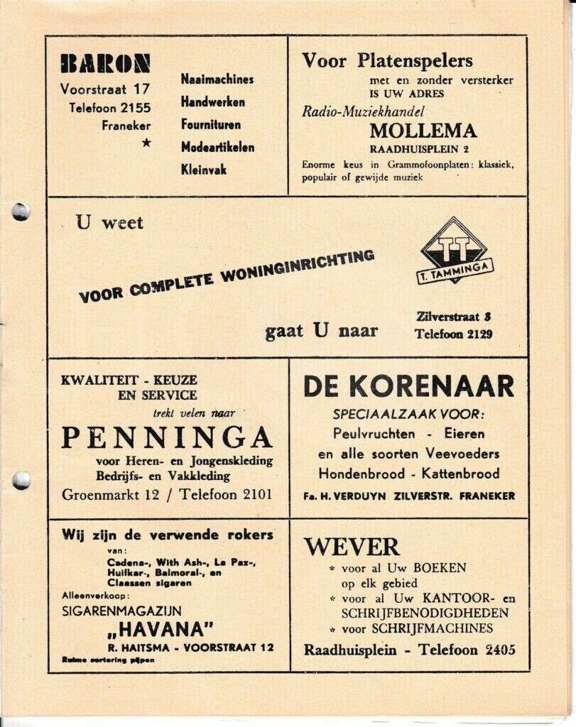 | Beschrijving: | It Fleurige Flittergat: 1967 4de jaargang nr. 7: Reklame; Baron naaimachines Voorstraat 17, Radio-muziekhandel Mollema Raadhuisplein 2 , Woninginrichting T.Tamminga Zilverstraat 3, Herenmode Penninga Groenmarkt 12, De Korenaar, zilverstraat 58, Sigarenmagazijn"Havana" K.Sijtsma Voorstraat 12, Boekhandel Wever Raadhuisplein 4 |