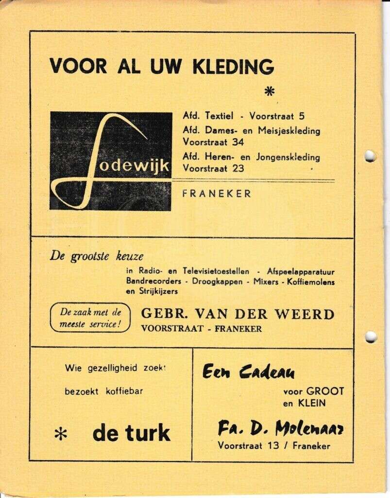 | Beschrijving: | It Fleurige Flittergat: 1968 4de jaargang nr. 11: Reklame; Lodewijk Textiel en kleding Voorstraat 5,23 en 34, Gebr. Van der Weert Voorstraat 25, Koffiebar De Turk, Fa.D.Molenaar Voorstaat 13 |