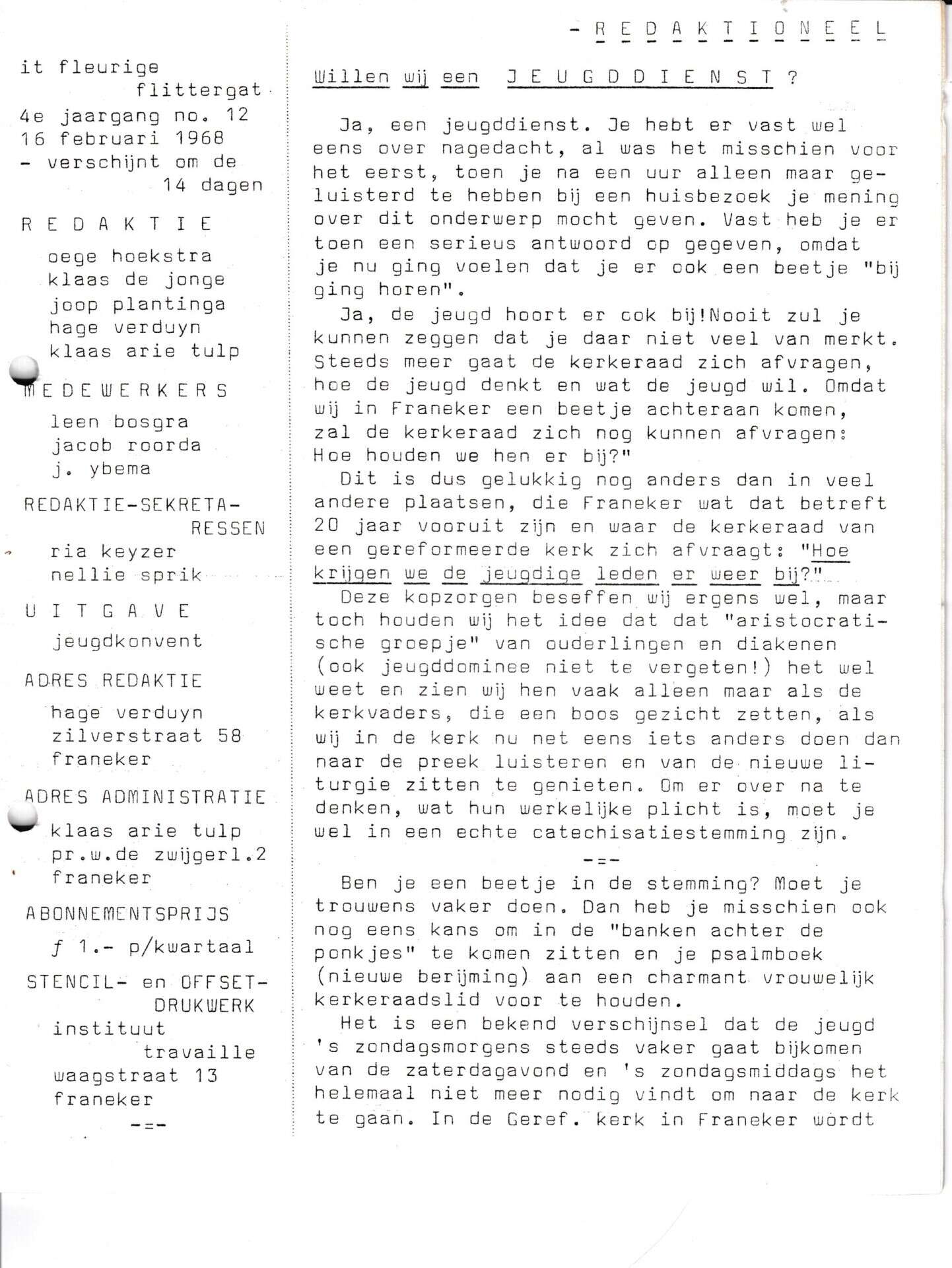Beschrijving:It Fleurige Flittergat: 1968 4de jaargang nr. 12: redactioneel: willen wij een Jeugdienst