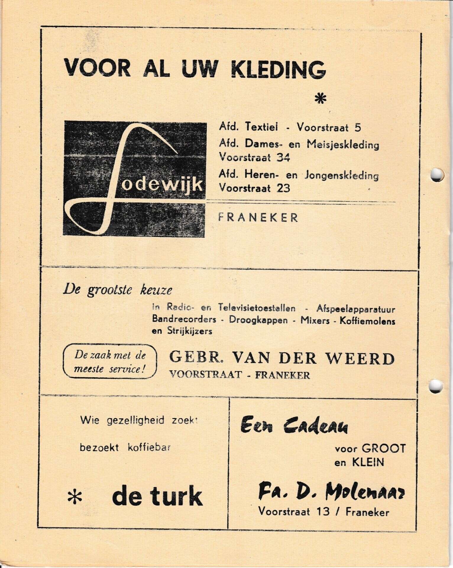 | Beschrijving: | It Fleurige Flittergat: 1968 4de jaargang nr. 16: Reklame; Lodewijk Textiel en kleding Voorstraat 5,23 en 34, Gebr. Van der Weert Voorstraat 25, Koffiebar De Turk, Fa.D.Molenaar Voorstaat 13 |