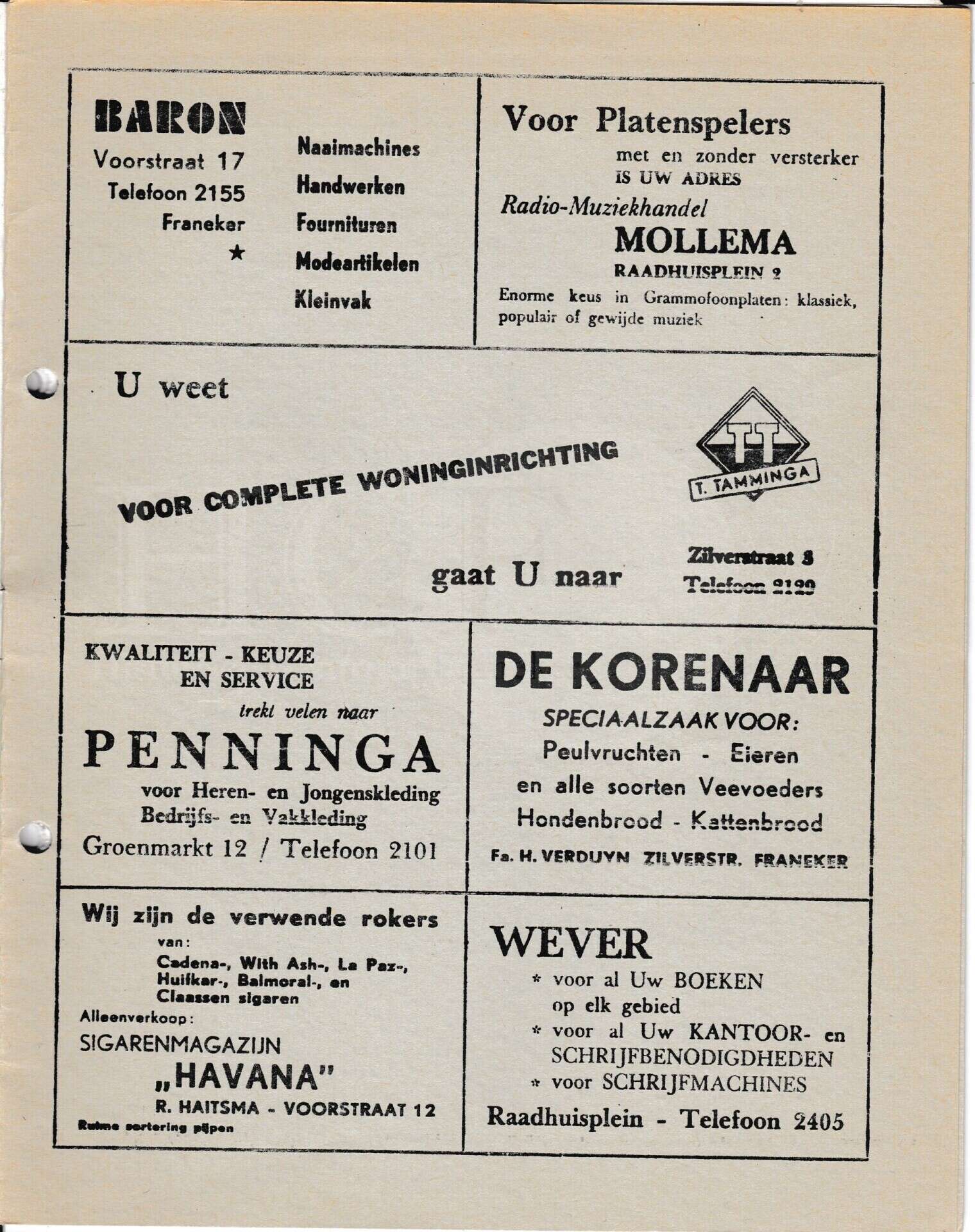 Beschrijving:It Fleurige Flittergat: 1968 4de jaargang nr. 17: Reklame; Baron naaimachines Voorstraat 17, Radio-muziekhandel Mollema Raadhuisplein 2 , Woninginrichting T.Tamminga Zilverstraat 3, Herenmode Penninga Groenmarkt 12, De Korenaar, zilverstraat 58, Sigarenmagazijn"Havana" K.Sijtsma Voorstraat 12, Boekhandel Wever Raadhuisplein 4